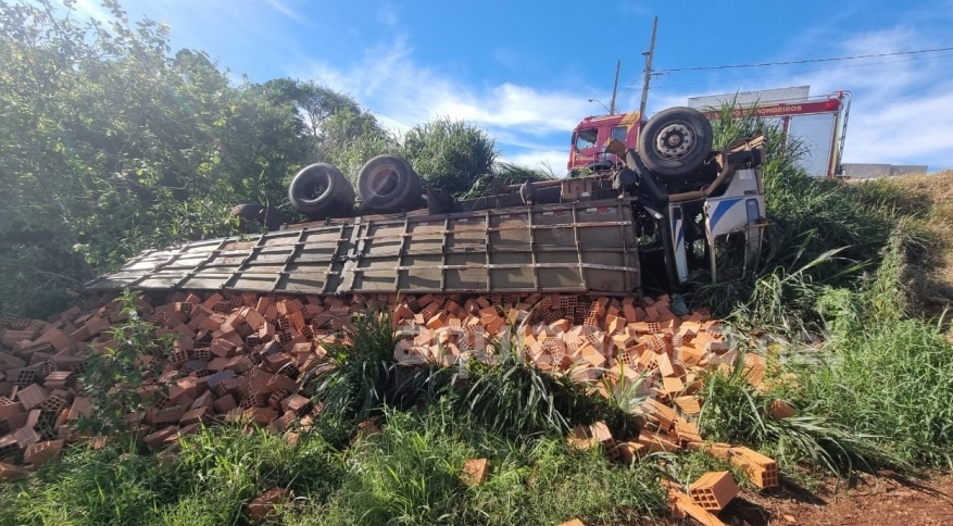 Um caminhão Ford, carregado com tijolos, tombou em uma ribanceira por volta das 16 horas desta terça-feira no loteamento Cataratas II, próximo a Assemar, em Marechal Cândido Rondon.