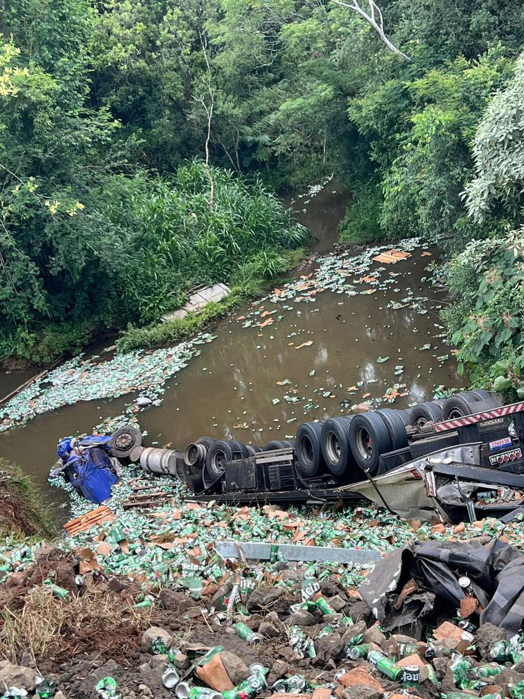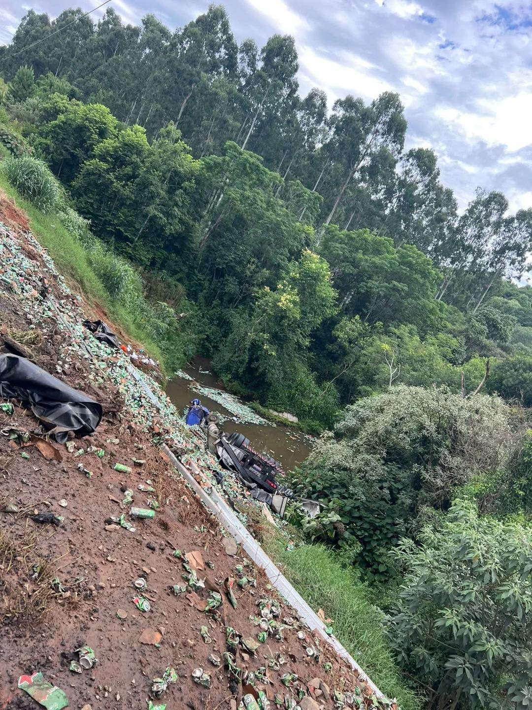 O condutor de um caminhão (com placas de Ponta Grossa), carregado de cerveja, perdeu o controle do veículo após um curva, saiu da pista, desceu uma ribanceira e caiu dentro do Rio Charqueada, onde ficou parcialmente submerso.