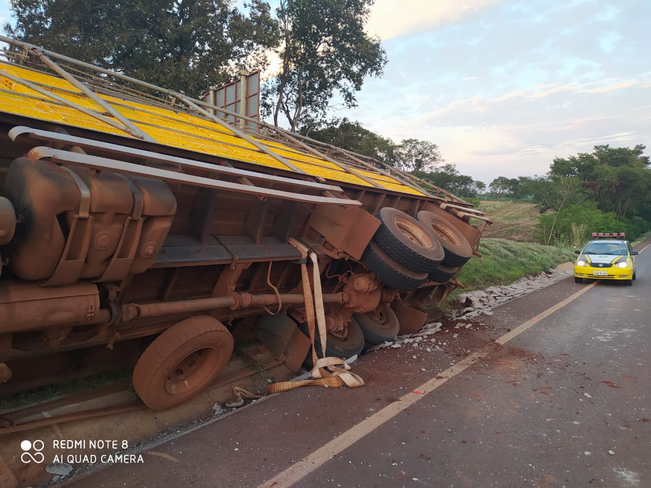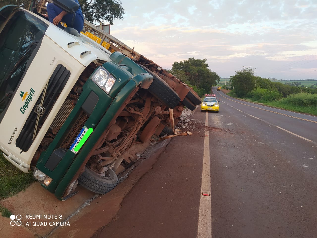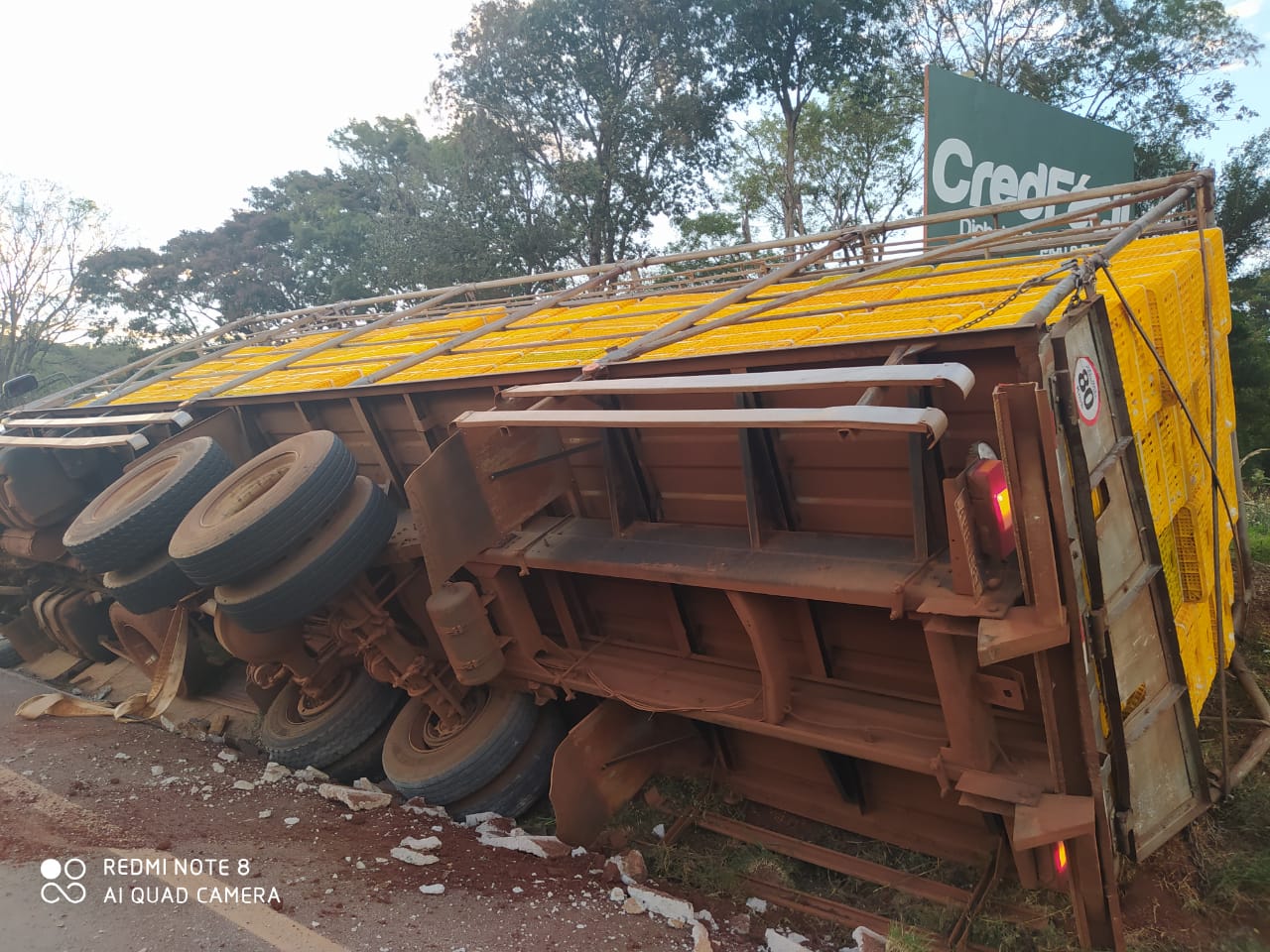Foi um acidente do tipo “choque contra canaleta” de um Caminhão Volvo, com placas de Marechal Rondon, que transportava frangos para Copagril, que saiu de Porto Mendes com destino ao frigorifico.