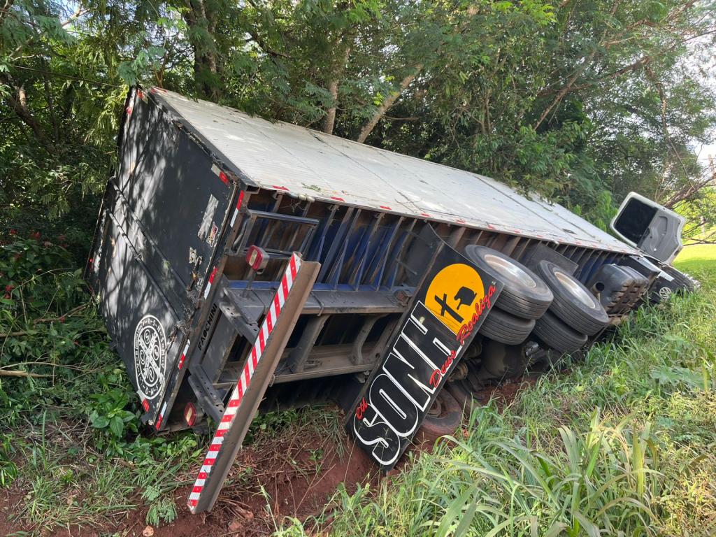 Caminhão sai da pista após manobra para evitar colisão na PR-589 em Nova Santa Rosa
