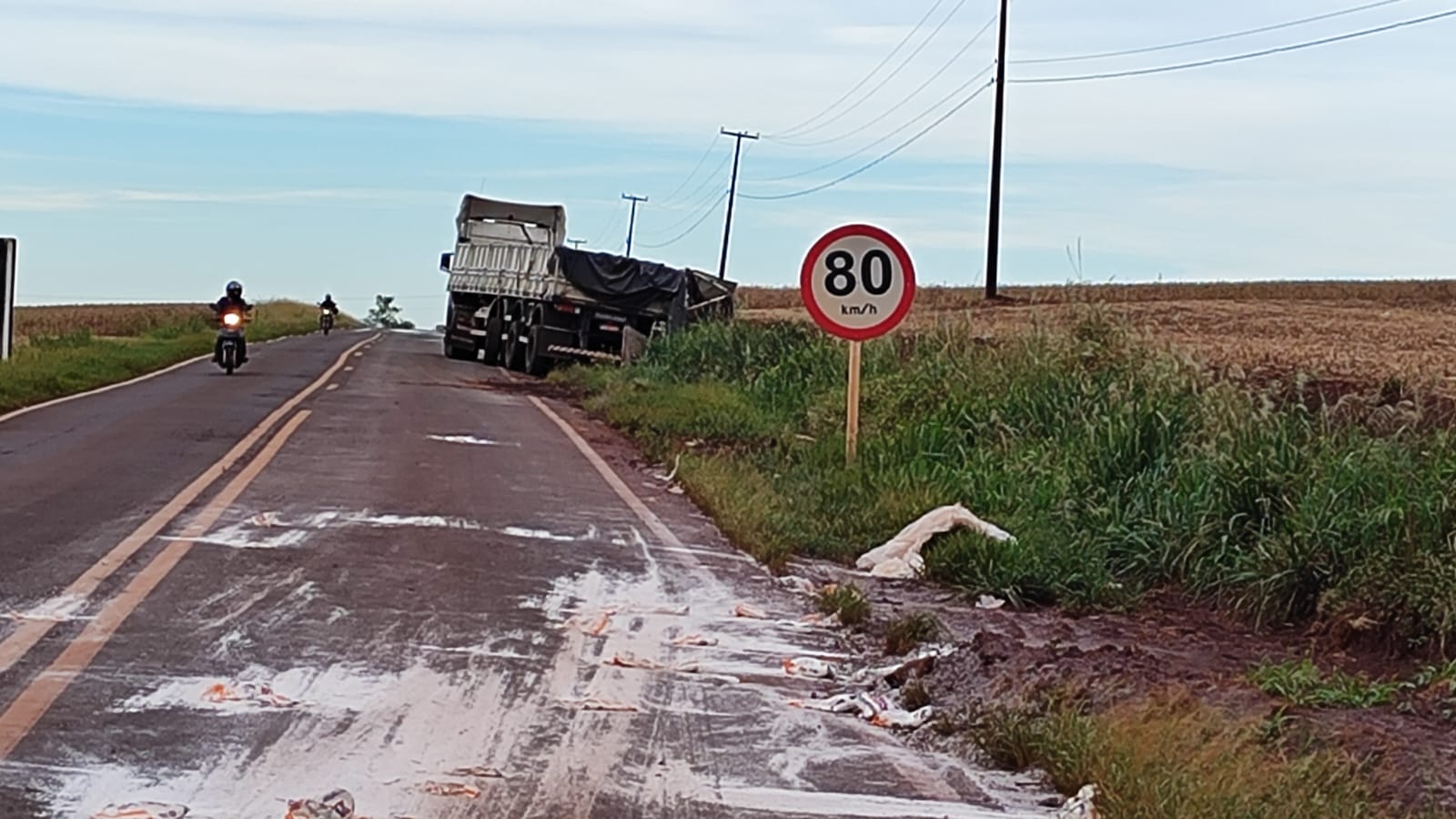 Carga com 31 toneladas de farinha fica espalhada na rodovia que liga Nova Santa Rosa a Maripá