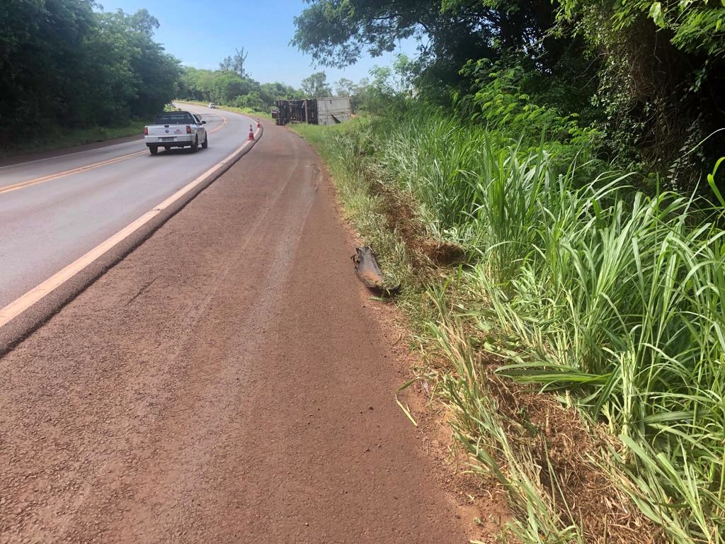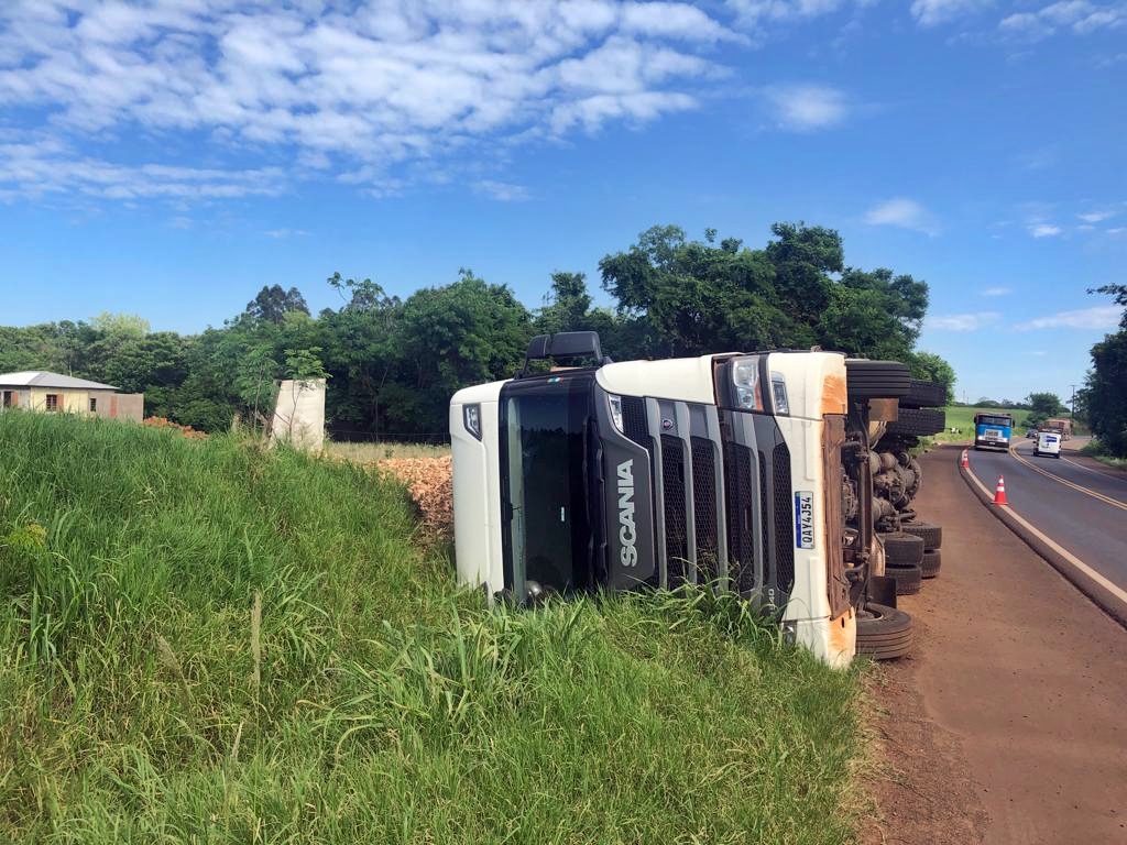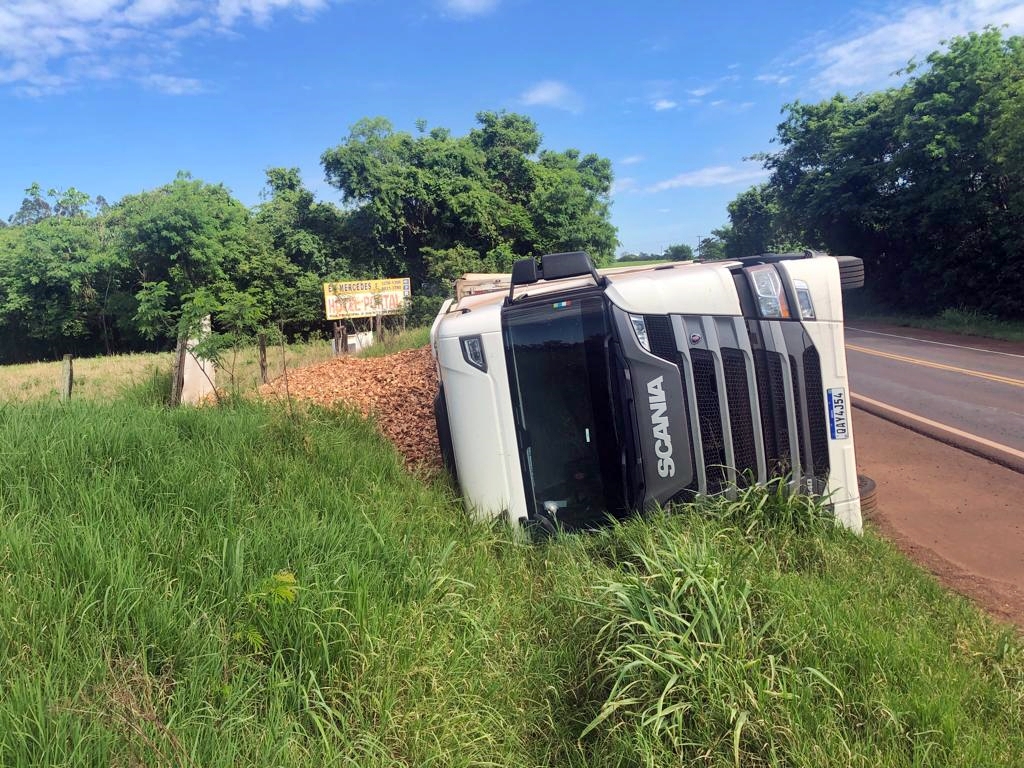 Carreta carregada com cavaco tomba na BR-163 próximo a Mercedes