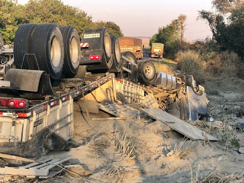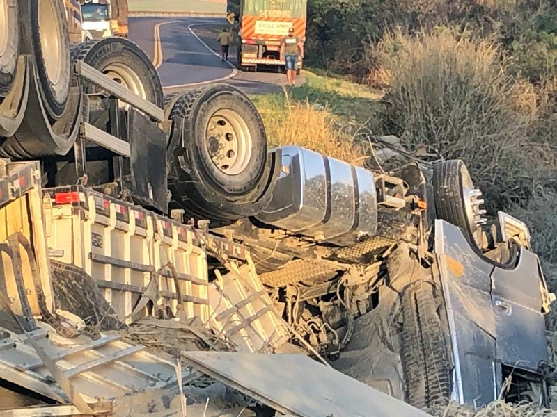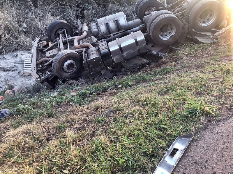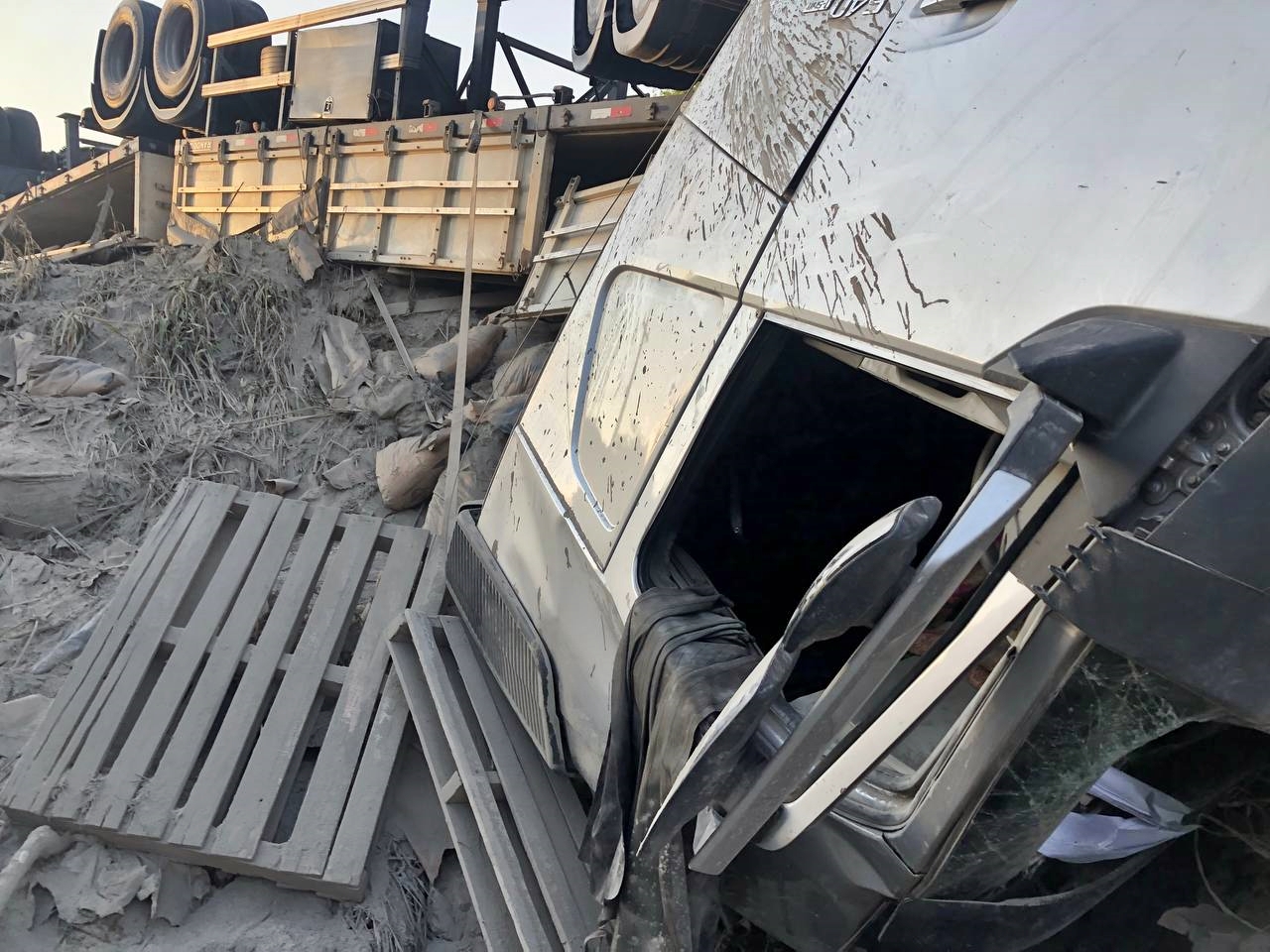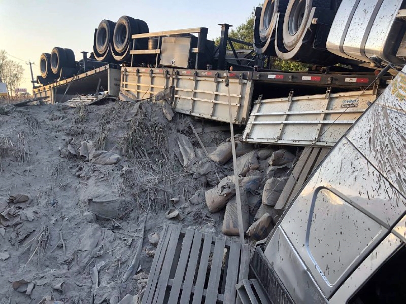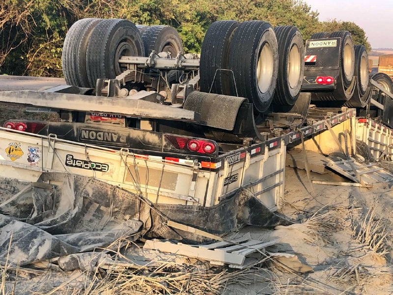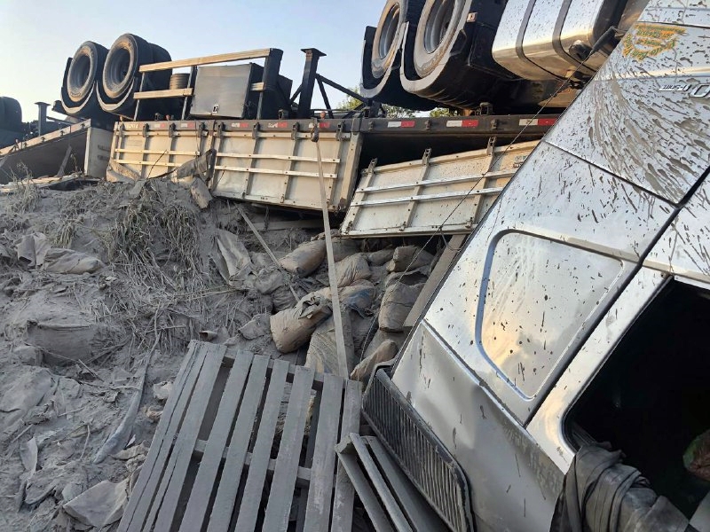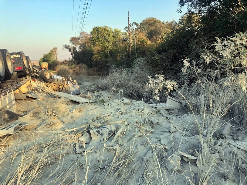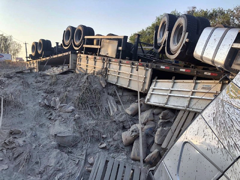 Carreta carregada com cimento tomba na Br-163 em Marechal Rondon