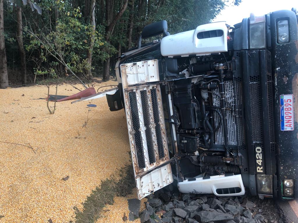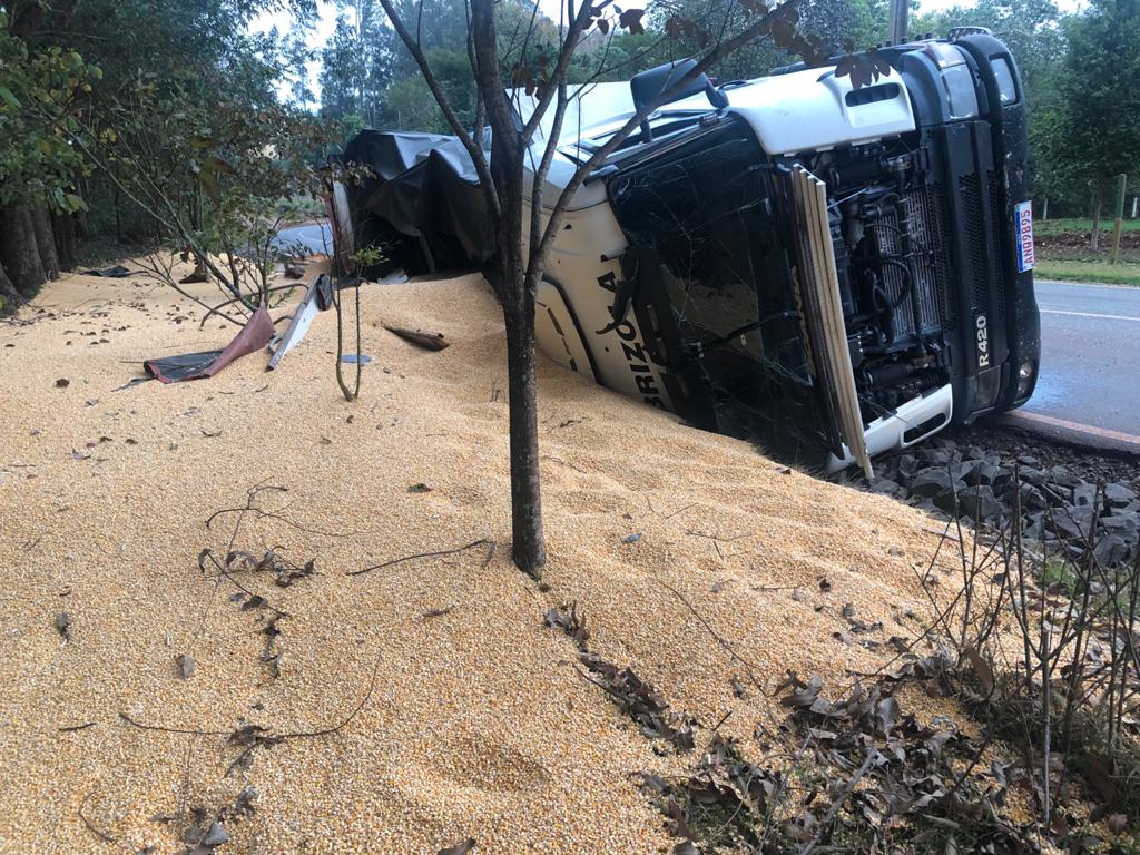 Carreta carregada com milho tomba na estrada do Lira a Novo Horizonte e motorista fica ferido