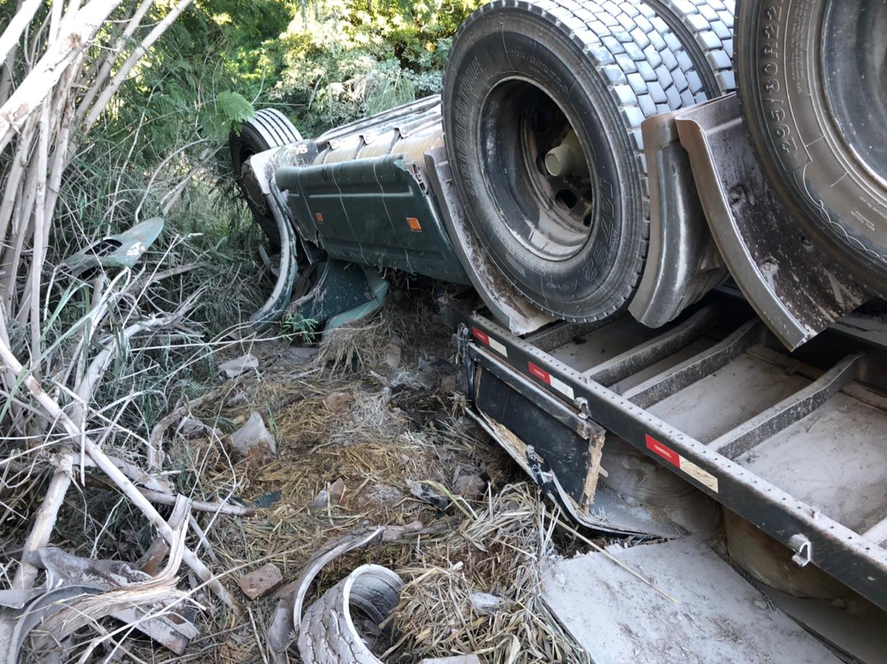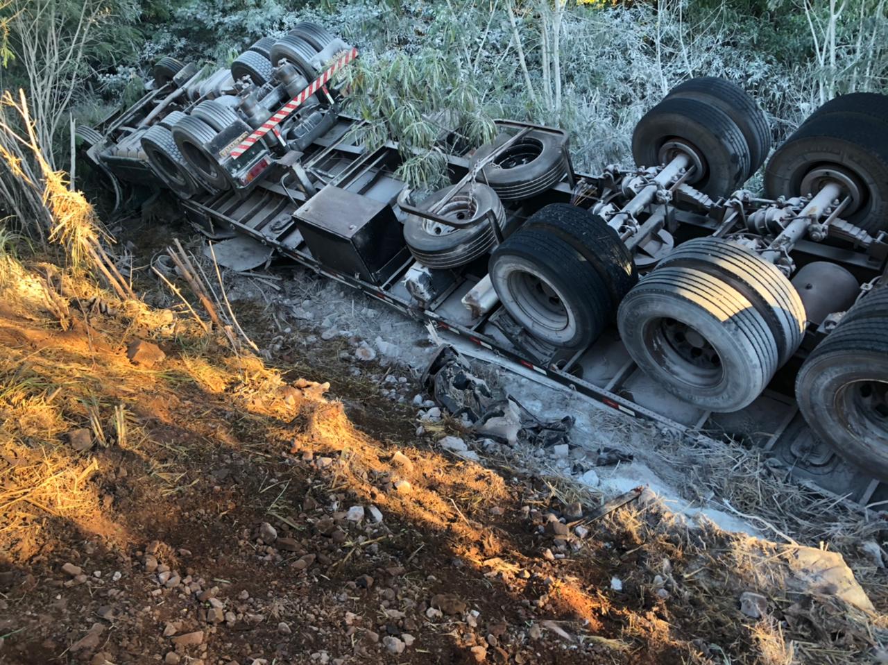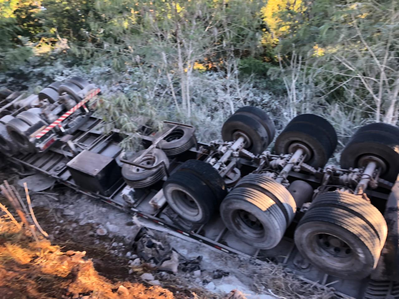 Carreta do Paraguai tomba na BR-163 saída de Marechal Rondon: condutor ficou ferido