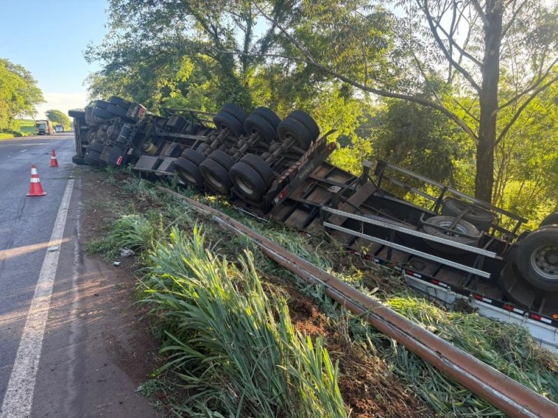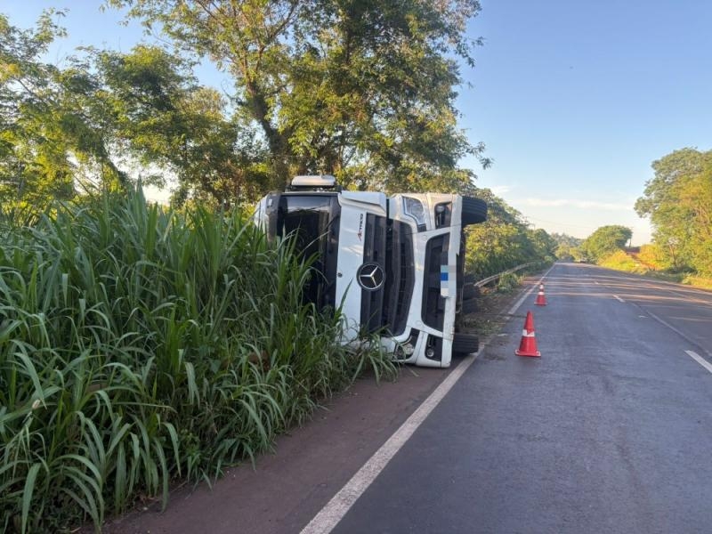 Carreta tomba na BR-163 em Mercedes e condutor fica ferido