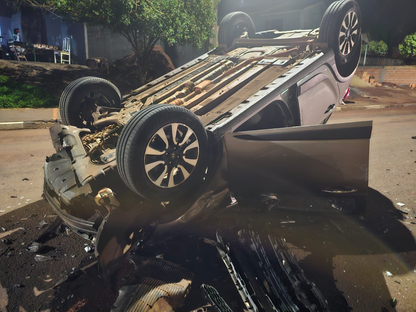 Carro capota após colisão frontal no Jardim Bressan, em Toledo
