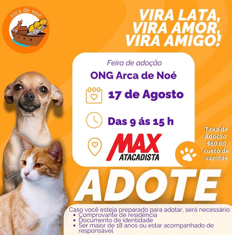 ONG Arca de Noé realiza neste sábado (17) mais uma Feira de Adoção de Cães e Gatos, no Max Atacadista