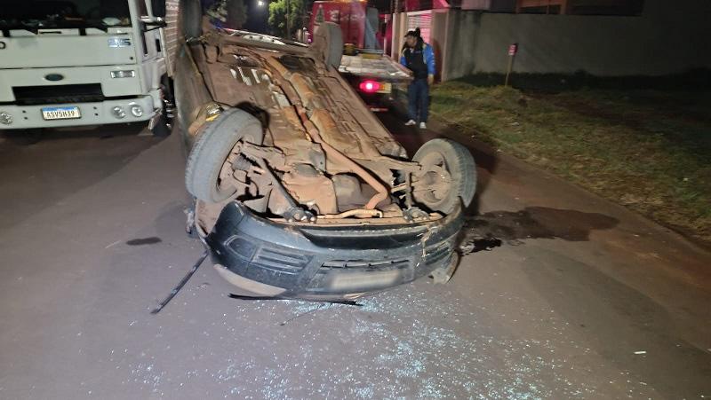 Um acidente chamou a atenção de moradores do bairro Jardim Gisela, em Toledo, durante a madrugada desta quinta-feira (3). Por volta da 1h50, um veículo Chevrolet Celta com placas de Cascavel colidiu contra um carro estacionado e capotou em seguida.
