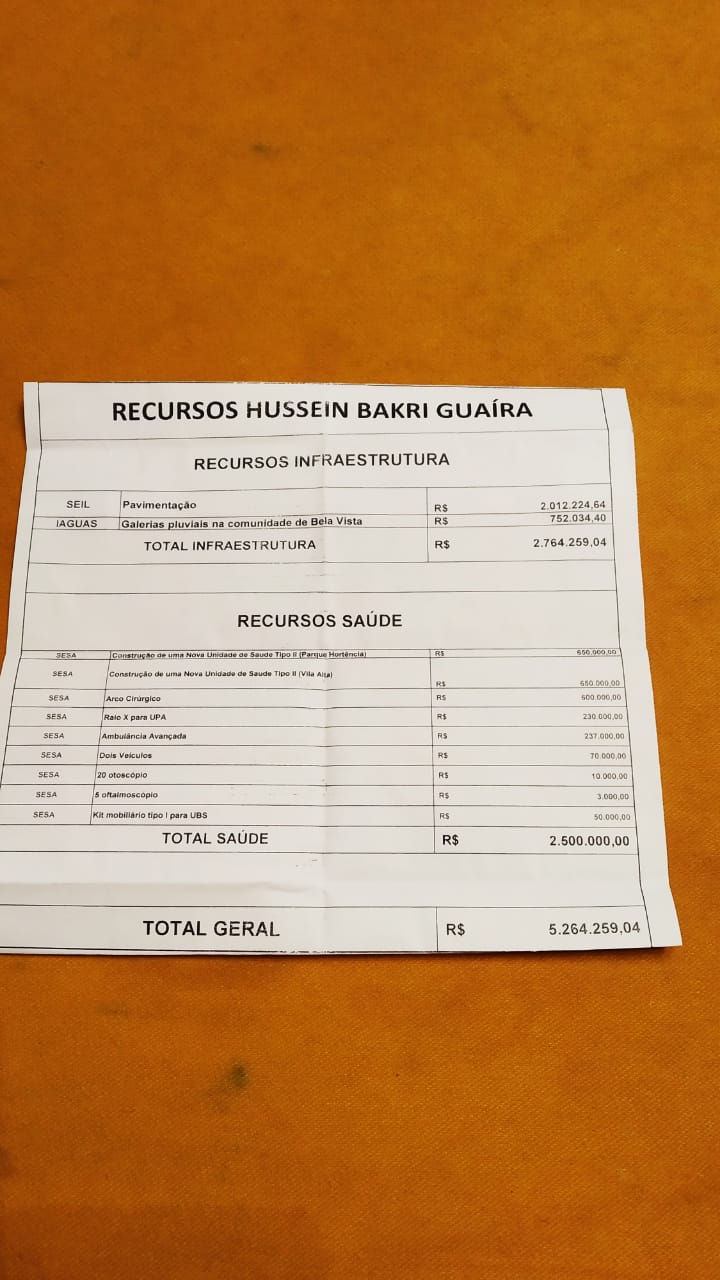 O deputado Hussein confirmou a liberação de mais de R$ 5.000.000,00 para o município de Guaira, contemplando obras de infraestrutura como pavimentações e galerias pluvias, além de grandes verbas para a área da saúde.