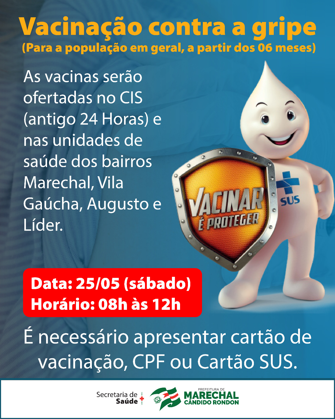 A Secretaria de Saúde de Marechal Cândido Rondon, com o objetivo de intensificar a campanha de imunização contra a influenza, realizará neste sábado (25) uma ação em cinco postos de saúde da sede, sendo eles o CIS (antigo 24 Horas) e as unidades de saúde dos bairros Marechal, Vila Gaúcha, Augusto e Líder. O horário de aplicação dos imunizantes será das 8h às 12h.