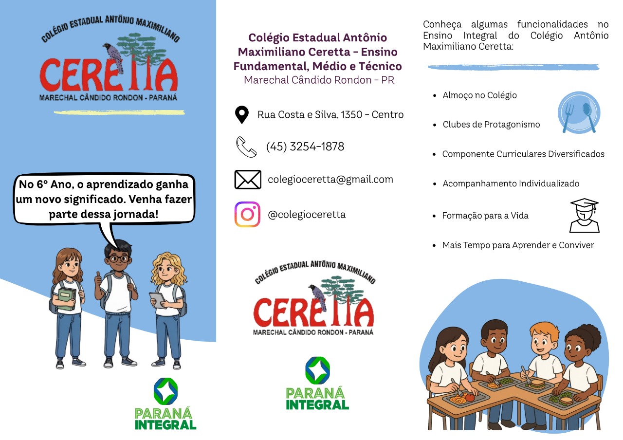 Além disso, convidam de forma especial os pais e responsáveis dos estudantes do 5º ano da rede municipal a conhecerem o Colégio Ceretta e as oportunidades oferecidas a partir do 6º ano em tempo integral, com uma proposta pedagógica que garante mais aprendizado, segurança e formação completa para seus filhos.