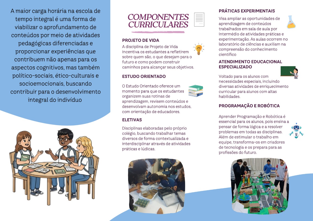 No Ensino Fundamental II (6º ao 9º ano), os alunos terão a oportunidade de estudar em tempo integral, com 45 horas semanais distribuídas em 9 aulas diárias. Essa proposta pedagógica amplia as possibilidades de aprendizagem, oferecendo atividades integradoras, culturais, esportivas e de desenvolvimento pessoal. Além de favorecer a formação integral do estudante, garante também a permanência em um ambiente seguro, educativo e estimulante durante todo o dia, proporcionando tranquilidade às famílias.