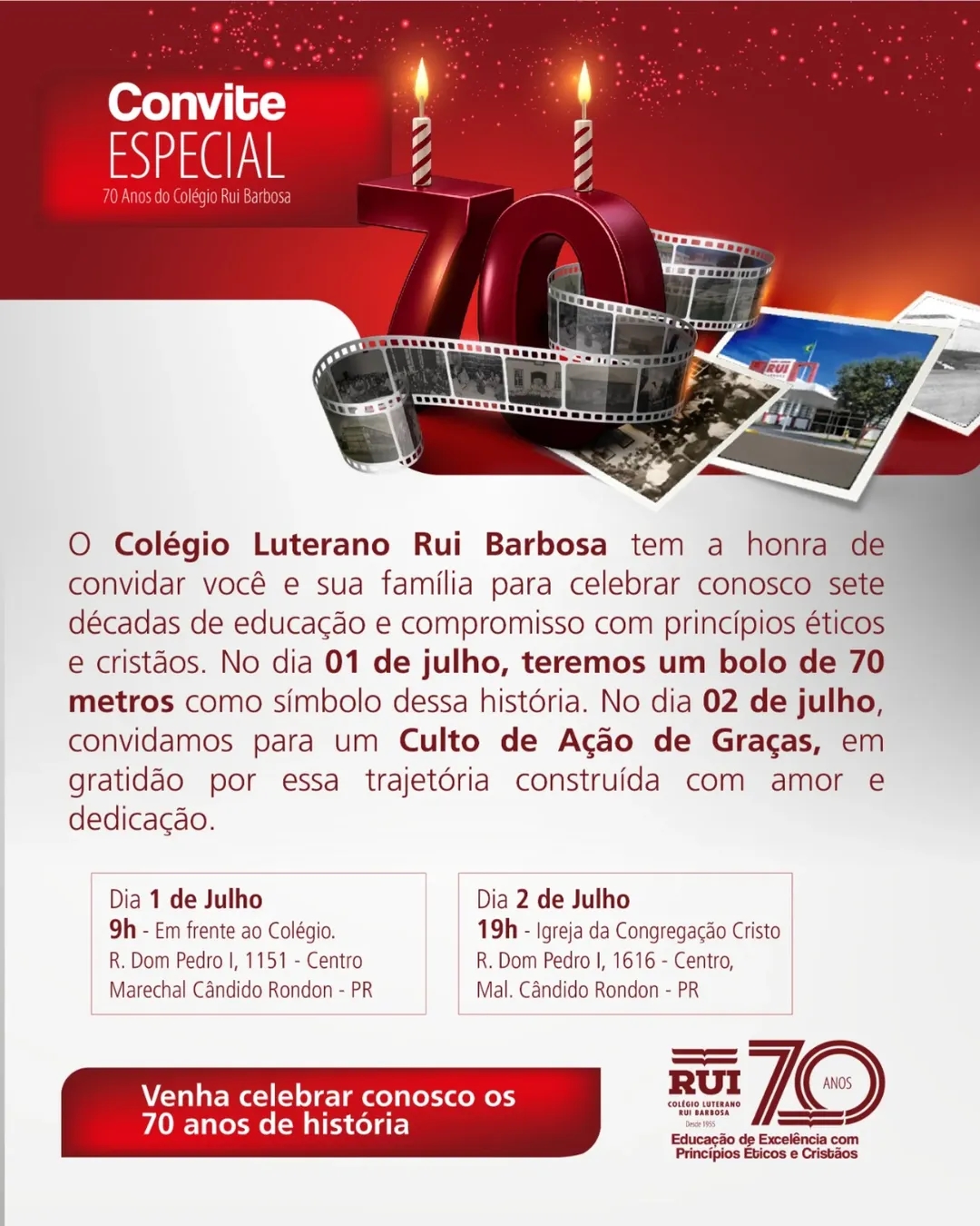 Para celebrar os 70 anos, a escola promove um evento especial a partir das 9 horas da manhã, em frente à sede, localizada na Rua Dom Pedro I, número 1151, no Centro de Marechal Cândido Rondon.