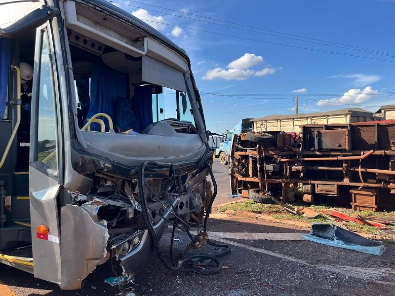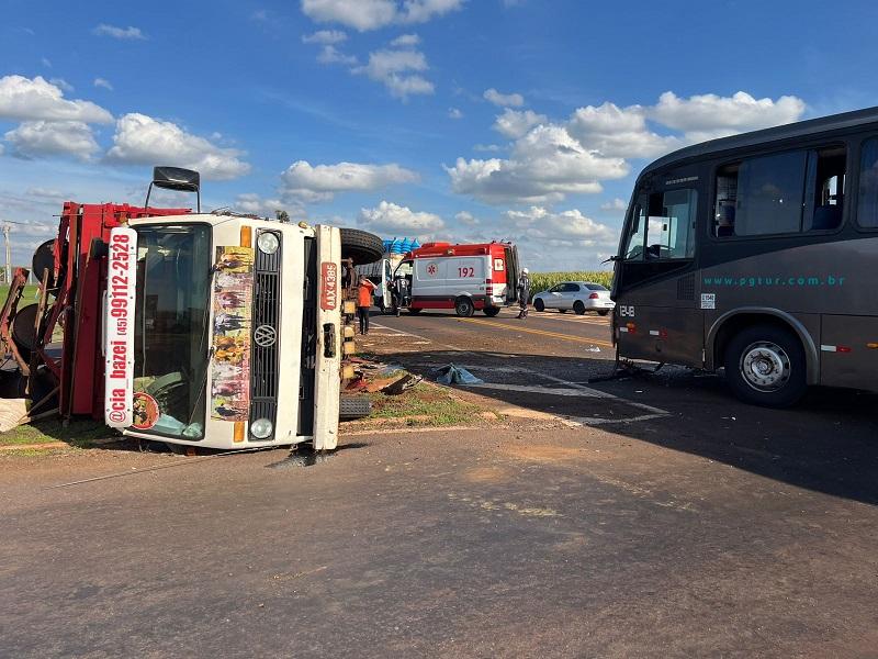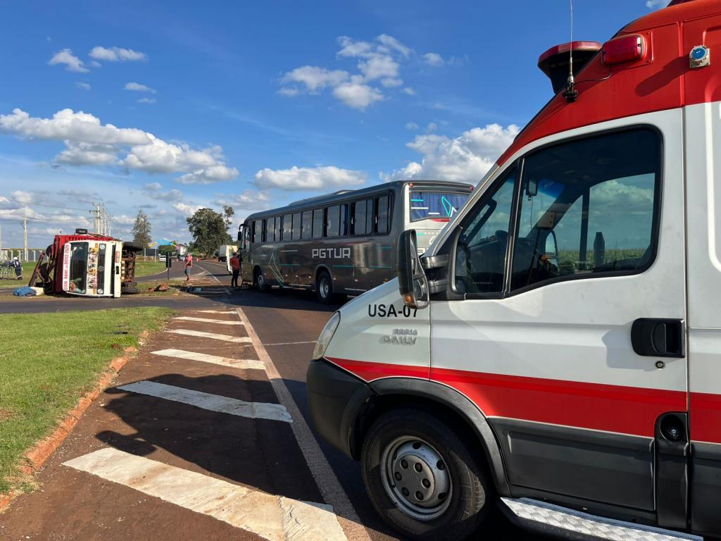 Com o impacto, o caminhão tombou e ficou de lado, enquanto o ônibus permaneceu parado na pista. O trânsito precisou ser desviado pelas laterais do trevo, gerando grande movimentação no local.