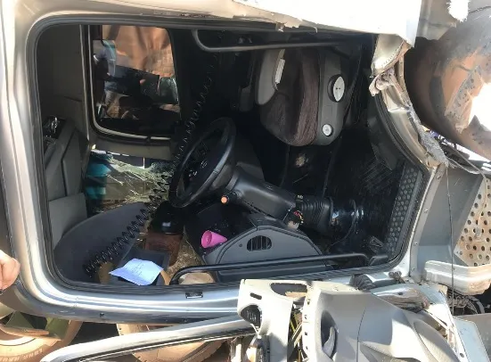 Com a violência do impacto a cabine do caminhão ficou pendurada e praticamente destruída.