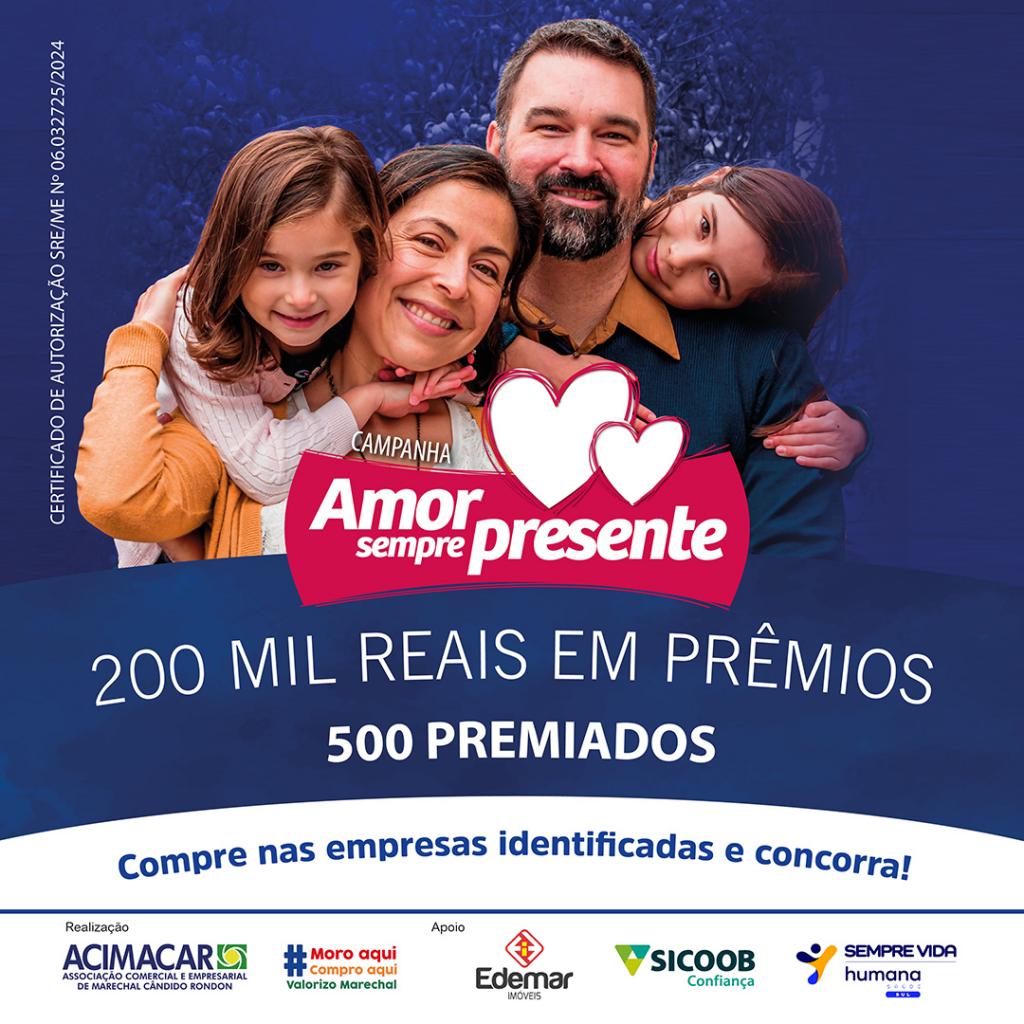 A campanha Amor Sempre Presente é realizada pela Acimacar por meio do Fundo de Campanhas e são legalizadas pela Secretaria de Acompanhamento Fiscal, Energia e Loteria , do Ministério da Economia e Fazenda.