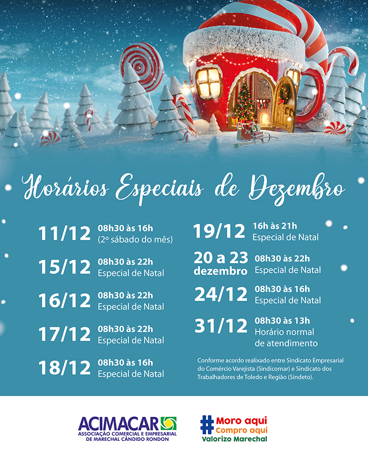 Já no dia 24, véspera de natal, o funcionamento do comércio local será das 08h30 às 16h00, e por fim, no dia 31, das 08h00 às 13h00.