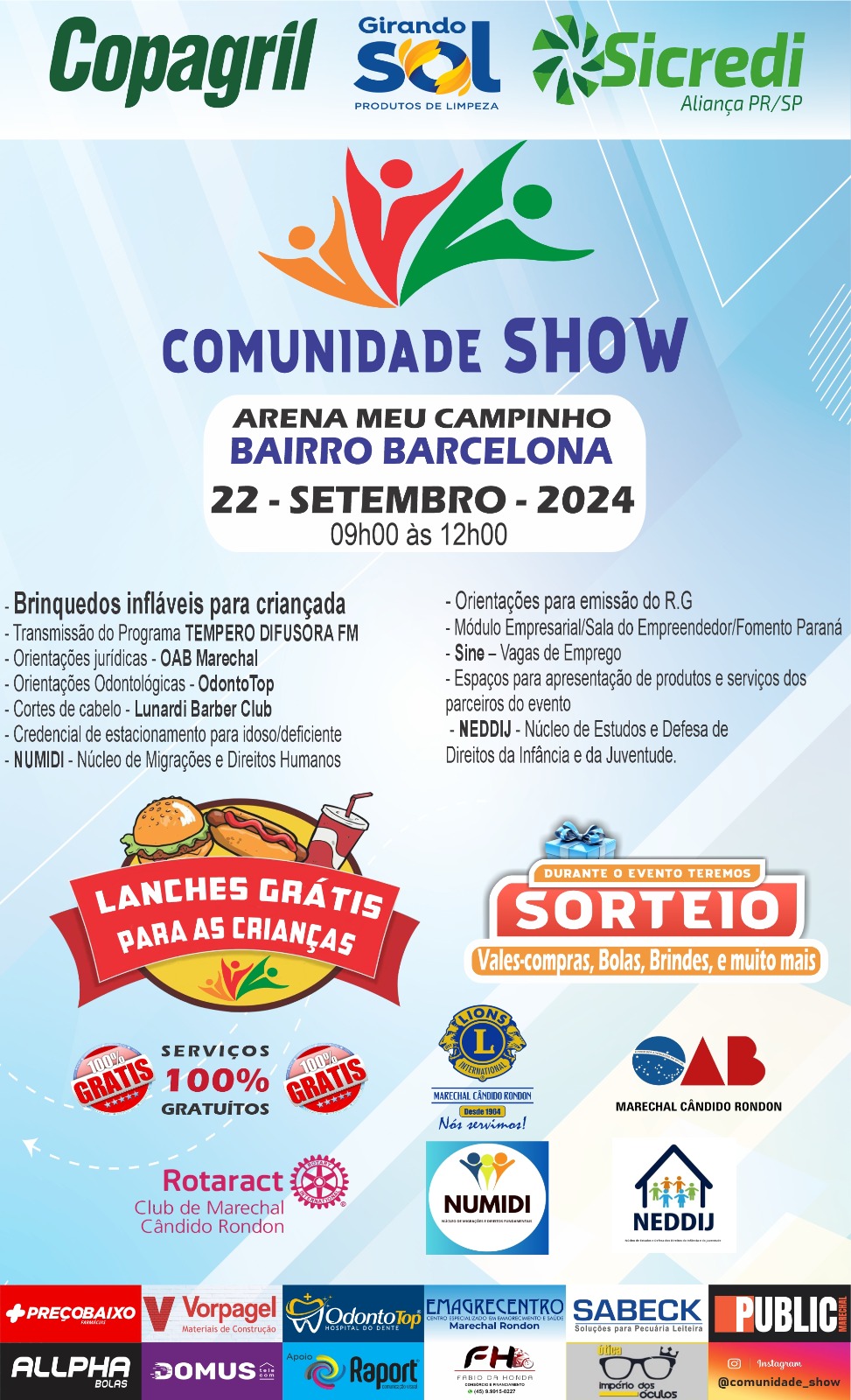 Acontece neste domingo, dia 22 de setembro, no espaço “Meu Campinho”, do Bairro Barcelona, a programação da 6º edição do “Comunidade Show” que objetiva levar um dia de serviços gratuitos, com o sorteio de prêmios, em uma programação voltada para todos os públicos / idades.