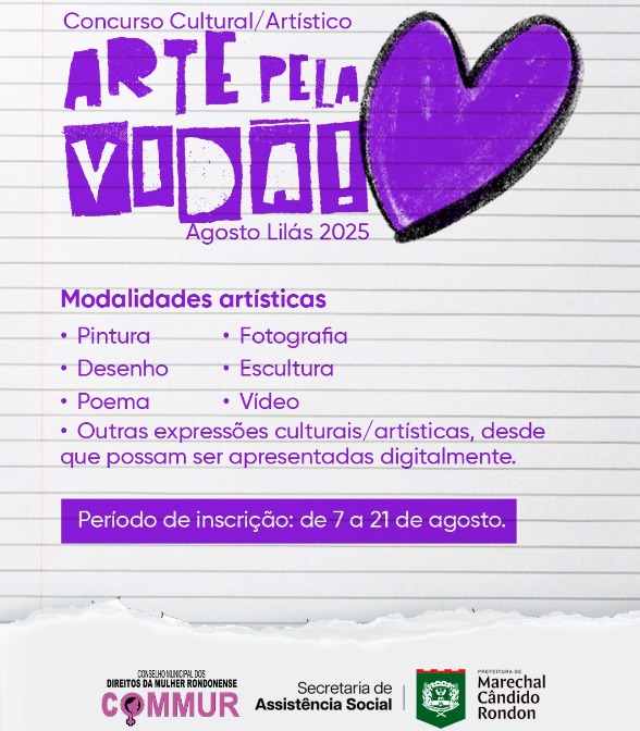 O Conselho Municipal dos Direitos da Mulher Rondonense (COMMUR), em parceria com a Secretaria Municipal de Assistência Social, lança o Concurso Cultural/Artístico “Arte Pela Vida – Agosto Lilás 2025”, como parte da campanha de conscientização pelo fim da violência contra a mulher.