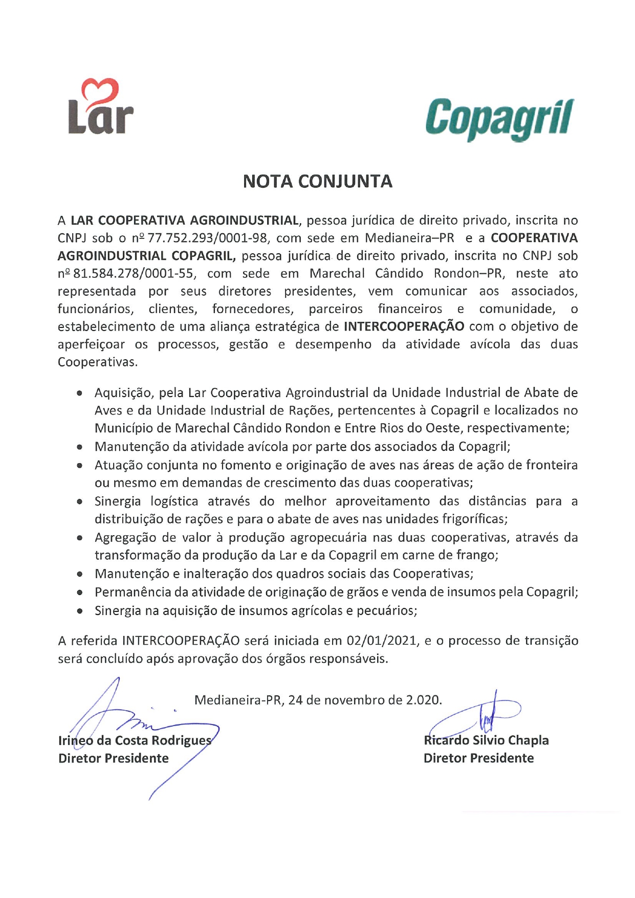 Confirmada venda da Unidade Industrial de Aves da Copagril para a Cooperativa Lar