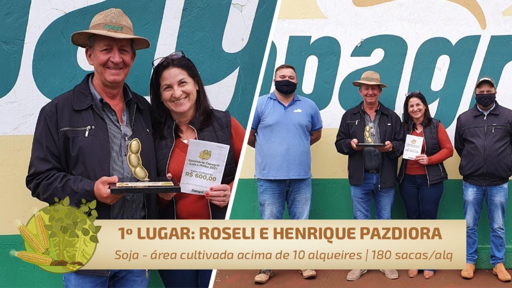 E em primeiro lugar, com produtividade de 180,0 sacas por alqueire, do Distrito de São Roque, Roseli e Henrique Pazdiora.