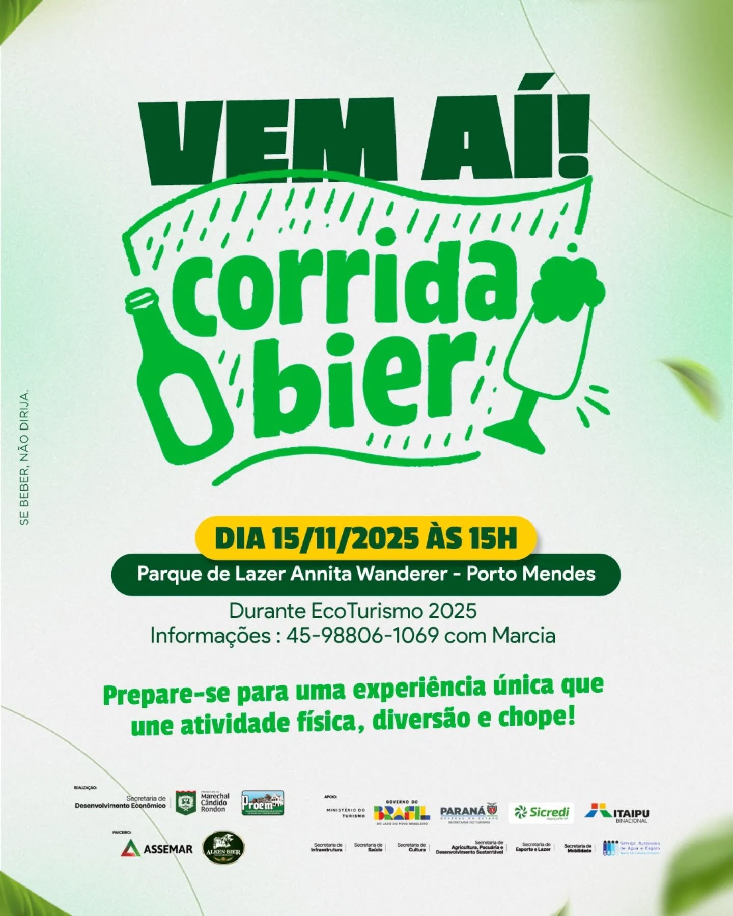 A Corrida Bier será uma das atrações da programação do Ecoturismo 2025 em Porto Mendes, no dia 15 de novembro, às 15h. A prova, organizada pela equipe da Assemar Runners, promete unir esporte, diversão e chope gelado, oferecendo uma experiência única à beira do lago.