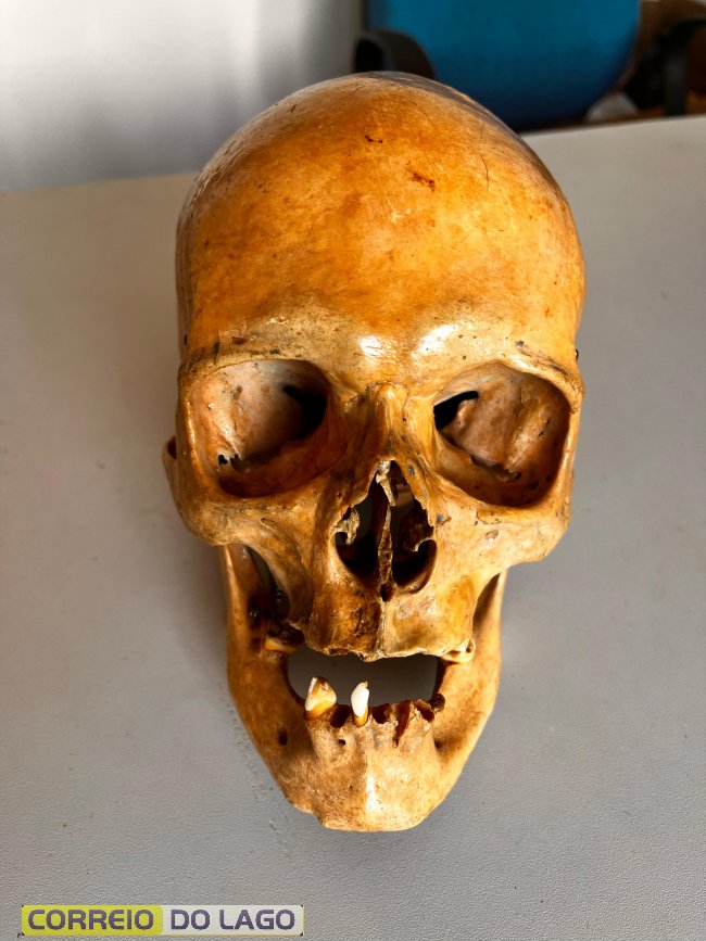 De acordo com informações preliminares, o artefato apresenta características de uso para pesquisa científica, uma vez que está envernizado e possui molas para fixação da mandíbula ao maxilar.