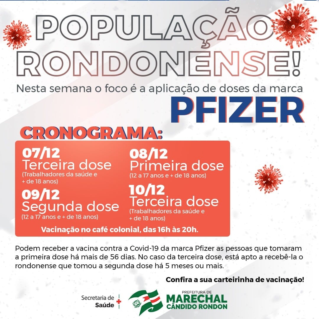 Marechal Cândido Rondon conta com grande estoque de doses da marca Pfizer. Por isso, a Secretaria Municipal de Saúde organiza o cronograma de vacinação desta semana com foco na aplicação de doses desta marca. O roteiro prossegue desta terça (07) até sexta-feira (10).