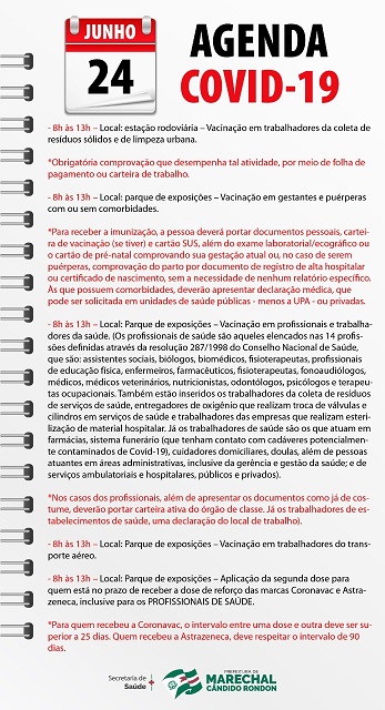 O cronograma desta quinta-feira, dia 24, no parque de exposições, da 8h às 13h, também contempla aplicação da segunda dose para quem está no prazo de receber a dose de reforço das marcas Coronavac e Astrazeneca, inclusive, os PROFISSIONAIS DE SAÚDE. Lembrando que, quem recebeu a Coronavac, o intervalo entre uma dose e outra deve ser superior a 25 dias. Por outro lado, quem recebeu a Astrazeneca, deve respeitar o intervalo de 90 dias.