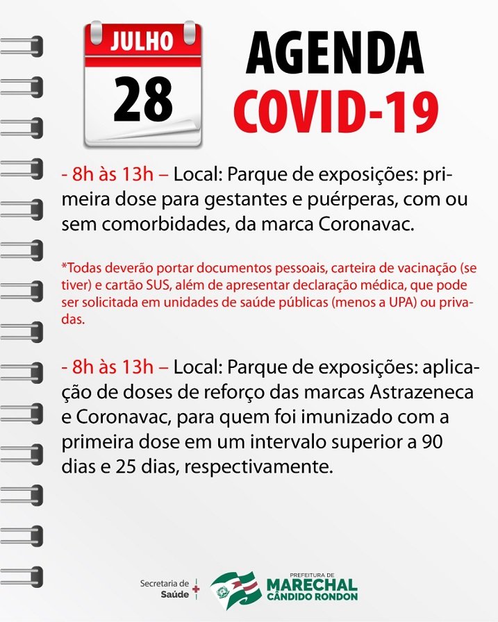A Secretaria de Saúde rondonense dá sequência nesta quarta-feira, dia 28, ao cronograma de vacinação contra a Covid-19. Serão aplicadas doses da marca Coronavac (primeira dose) em gestantes e puérperas, com ou sem comorbidades.