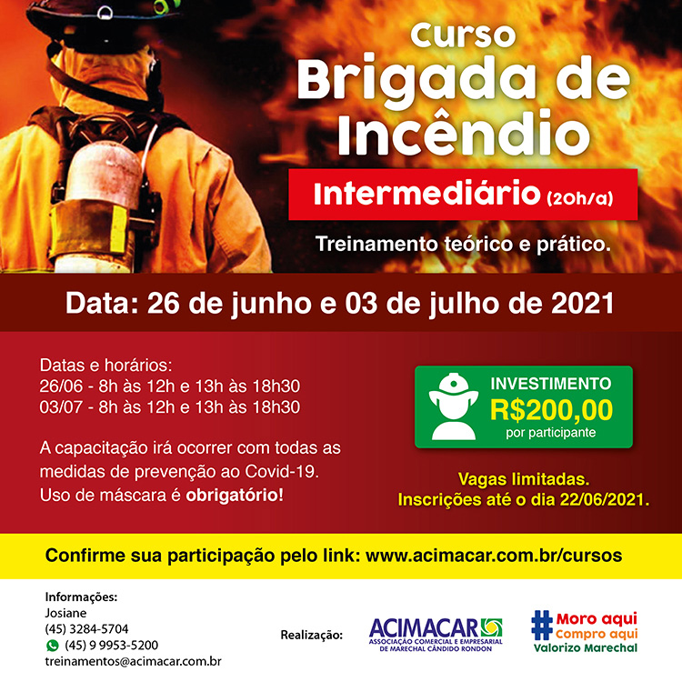 Os interessados em participar do curso de Brigada de Incêndio promovido pela Acimacar ainda podem se inscrever na capacitação, que acontece nos próximos dois sábados: 26 de junho e 03 de julho, das 8 às 12 horas e das 13 às 18 horas.