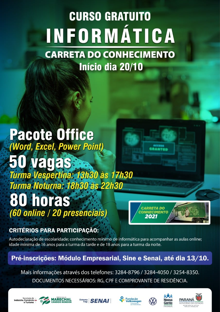 Conforme o diretor da Agência do Trabalhador de Marechal Rondon, Sérgio Marcucci, durante o curso gratuito de informática será trabalhado com o Pacote Office, respectivamente os programas Word, Excel e Power Point. “Este curso está inserido no programa Carreta do Conhecimento, do governo do estado, no entanto os trabalhos nas carretas estão suspensos em respeito aos protocolos da Covid-19, de modo que as aulas em Marechal Rondon serão ministradas no SENAI. O prefeito Marcio Rauber escolheu este curso para qualificar jovens e adultos rondonenses”, pontua.
