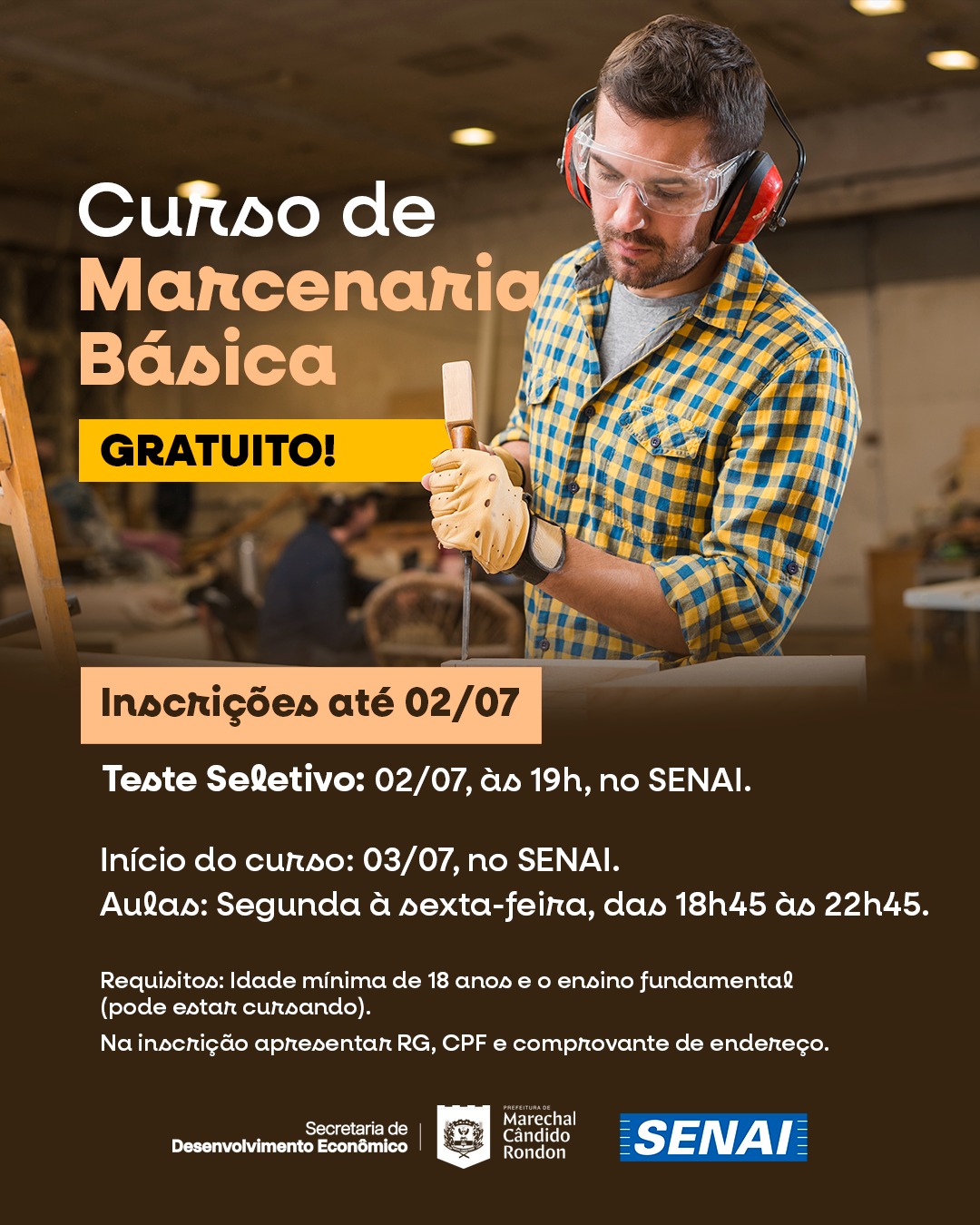 Foi prorrogado para o dia 3 de julho o início do curso gratuito de marcenaria básica, promovido pela prefeitura de Marechal Cândido Rondon, por meio da Secretaria de Desenvolvimento Econômico e do Serviço Nacional de Aprendizagem Industrial (SENAI).