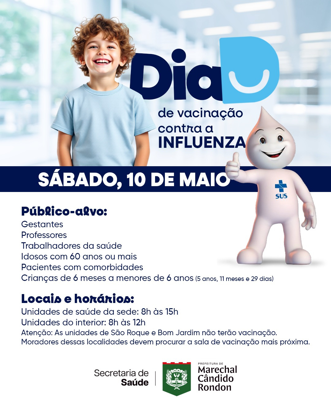 A Secretaria de Saúde de Marechal Cândido Rondon reforça à população que a vacinação contra a influenza segue em andamento desde o início de abril. Neste sábado, dia 10, acontecerá o Dia D de aplicação dos imunizantes em todas as salas de vacinação do município. Na sede, o atendimento será das 8h às 15h, e no interior, das 8h às 12h. Nas unidades de saúde de São Roque e Bom Jardim não haverá vacinação. Os moradores dessas localidades devem procurar a sala de vacinação mais próxima para receber a imunização.