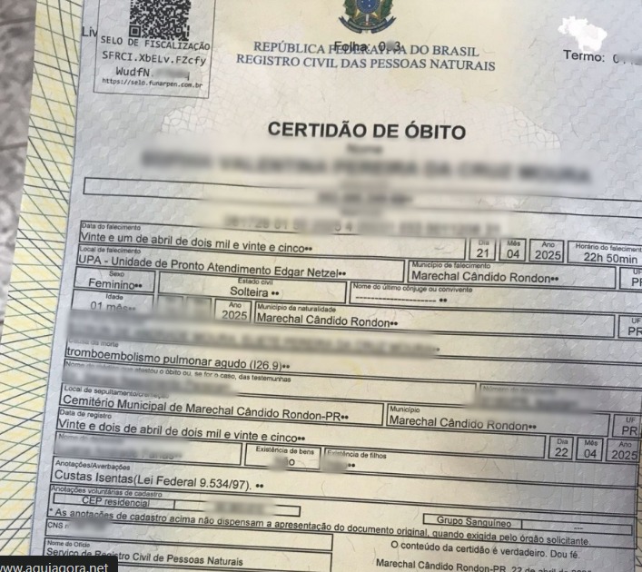 Foi divulgado pela família da bebê de apenas um mês, que tragicamente faleceu na noite da segunda-feira (21), a causa morte da pequena. Ela foi vítima de tromboembolismo pulmonar agudo, conforme consta na certidão de óbito.