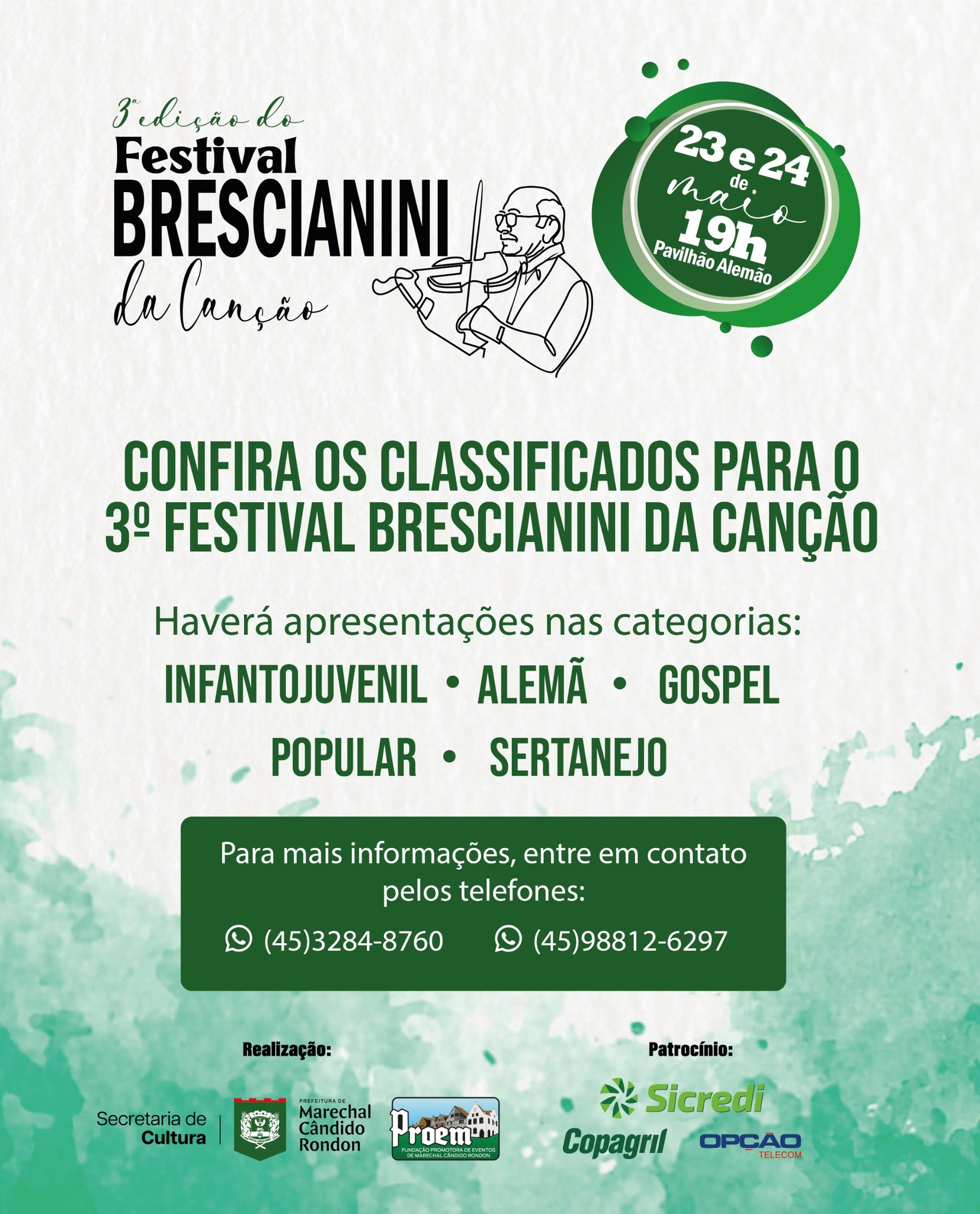 O Festival Brescianini da Canção contará com três categorias: alemã, com três candidatos a partir de 10 anos; infantojuvenil livre, destinada a participantes de 10 a 15 anos completos até a data do evento, com 15 inscritos; e adulto, para candidatos a partir de 16 anos, dividida nos estilos gospel, com 15 participantes; popular, também com 15; e sertanejo, que terá 10 concorrentes. A lista completa dos classificados pode ser consultada em https://drive.google.com/…/1UU79xRT6bn2ETUZq-c…/view.