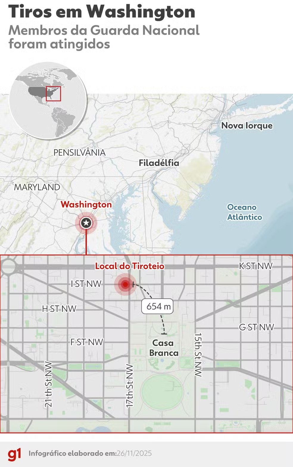 O presidente Donald Trump não estava na Casa Branca no momento do ataque. Ele deixou Washington na noite de terça-feira (25) e viajou para a Flórida, onde deve passar o feriado de Ação de Graças. O vice-presidente J.D. Vance também não está na cidade.