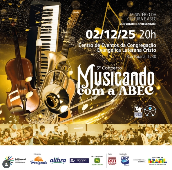Nesta terça-feira, 02 de dezembro, o Centro de Eventos da Congregação Evangélica Luterana Cristo será palco do encerramento do Projeto Musicando com a ABEC – Ano 3, com a apresentação musical de alunos e instrutores em formato de orquestra.
