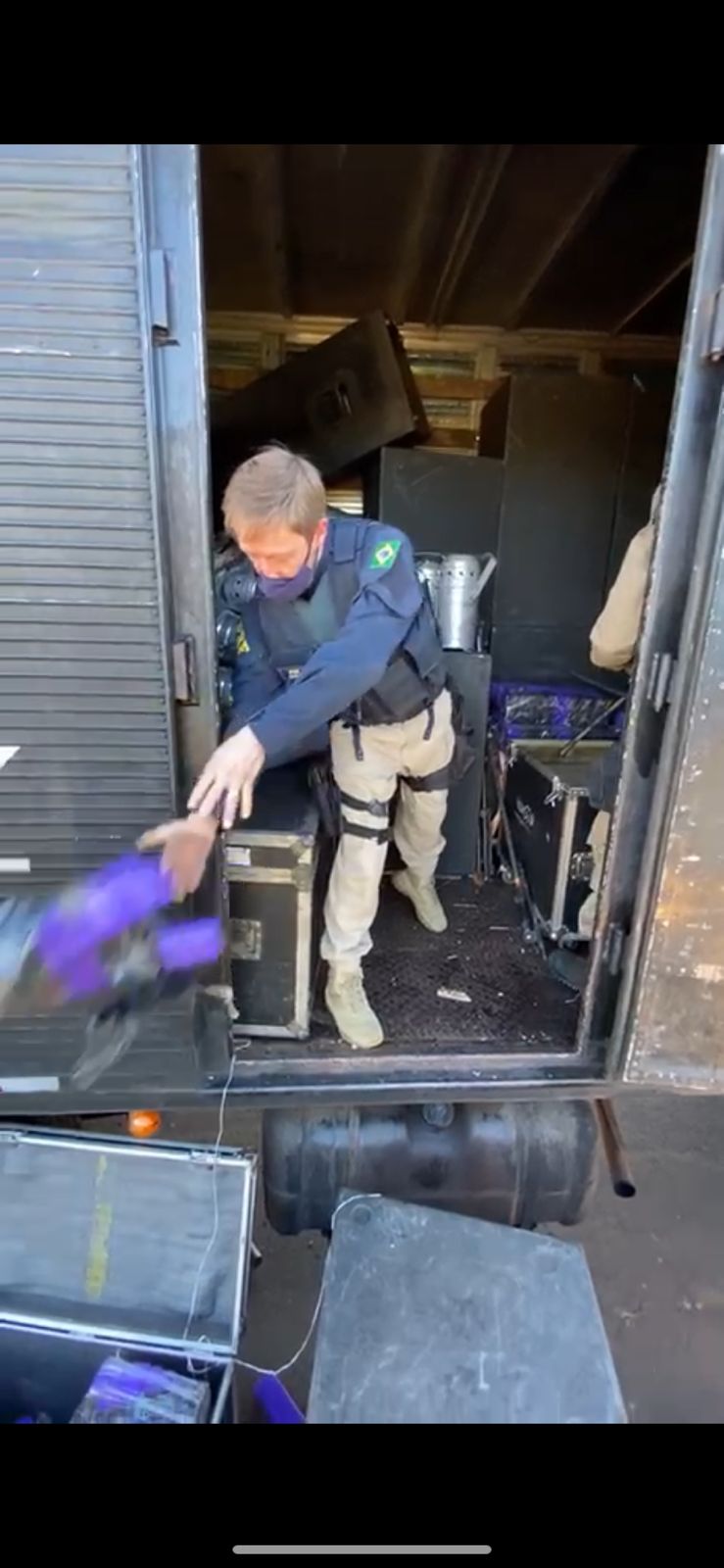 O cão Axel deu sinal positivo para presença de droga, escondida no baú, dentro de caixas de som e diversos equipamentos para eventos.