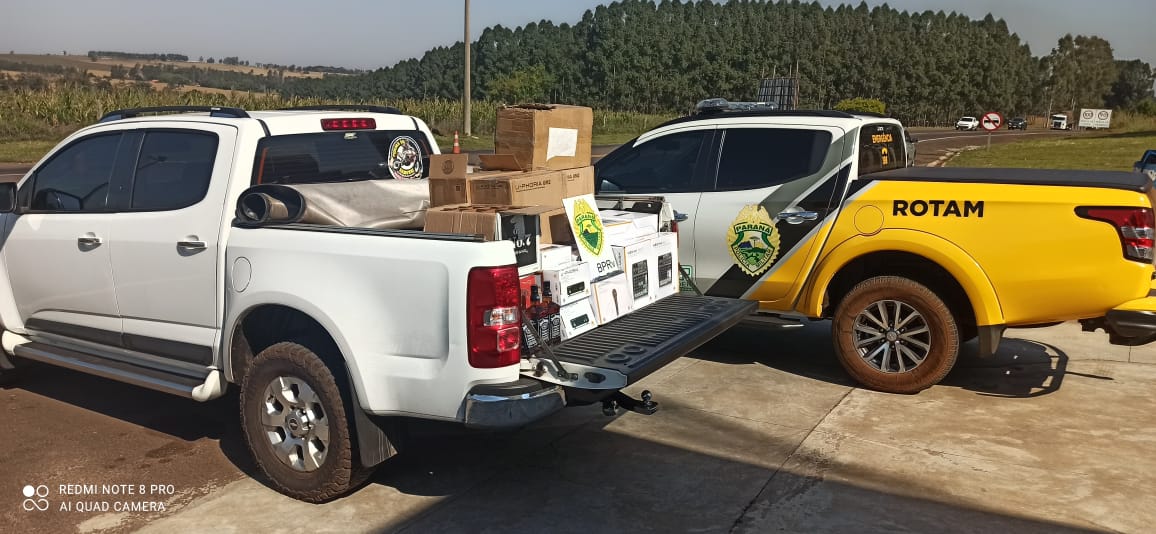 O condutor e o passageiro foram qualificados e a mercadoria e o veículo foram encaminhados a Delegacia da Receita Federal de Guaíra.