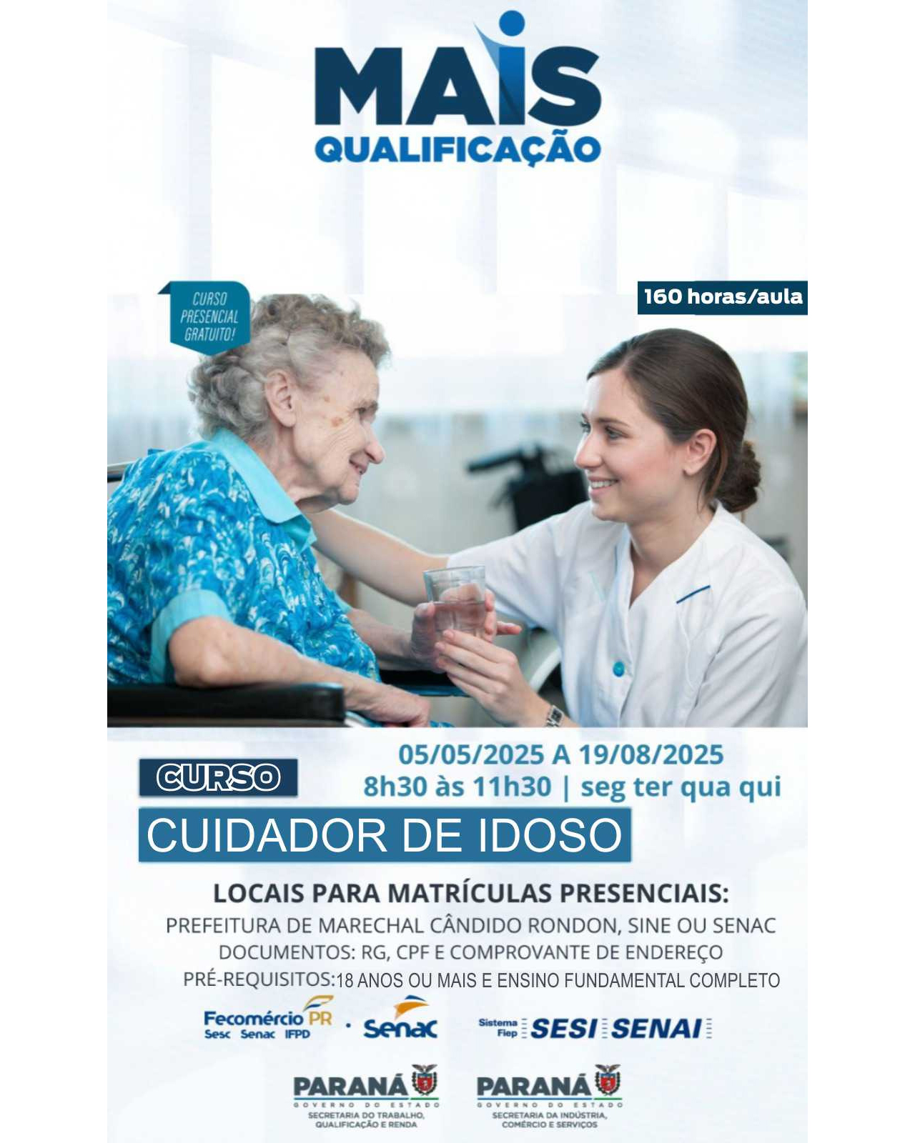 O Governo do Estado, por meio da Secretaria de Estado do Trabalho, Qualificação e Renda (SETR), em parceria com a Agência do Trabalhador (SINE), a prefeitura de Marechal Cândido Rondon, por meio da Secretaria de Desenvolvimento Econômico, e o SENAC, está oferecendo mais uma capacitação por meio do programa Mais Qualificação: o curso de Cuidador de Idoso.