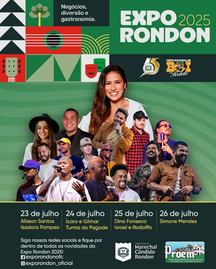 A Expo Rondon 2025 será realizada de 23 a 27 de julho, no parque de exposições. O evento é uma realização da prefeitura de Marechal Cândido Rondon, com organização da CCO, presidida pelo prefeito Adriano Backes, tendo como vice-presidente o vice-prefeito e secretário interino de Cultura, Vanderlei Sauer, e como diretor-executivo o secretário de Gestão de Governo, Gilmar Dattein, além da PROEM (Fundação Promotora de Eventos), presidida por Junior Paulinho Nisczack, com o apoio de entidades e patrocinadores.