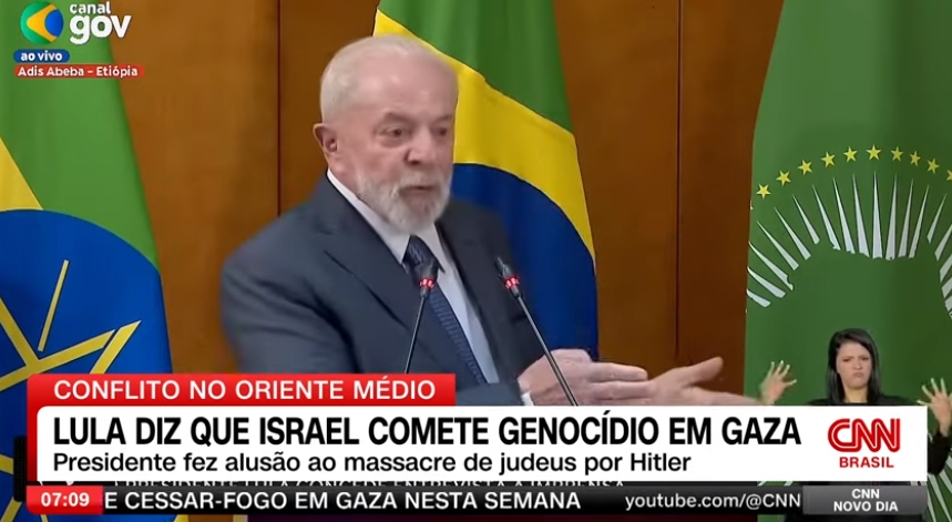 “O que está acontecendo na Faixa de Gaza com o povo palestino não existiu em nenhum outro momento histórico. Aliás, existiu. Quando Hitler resolveu matar os judeus”, disse ele, durante a entrevista coletiva que encerrou sua viagem à Etiópia.