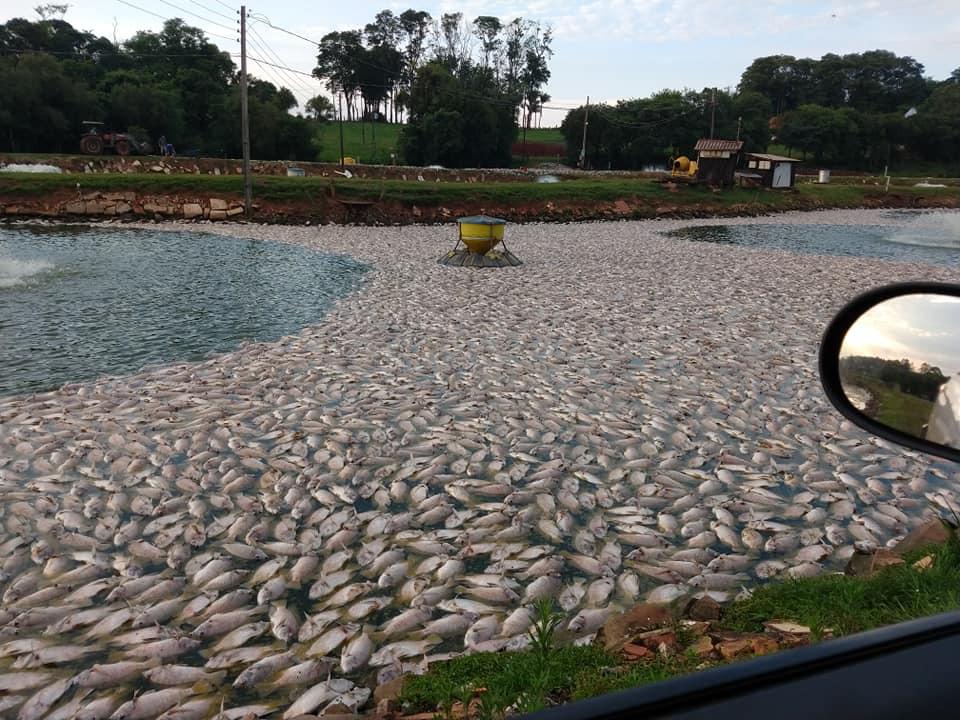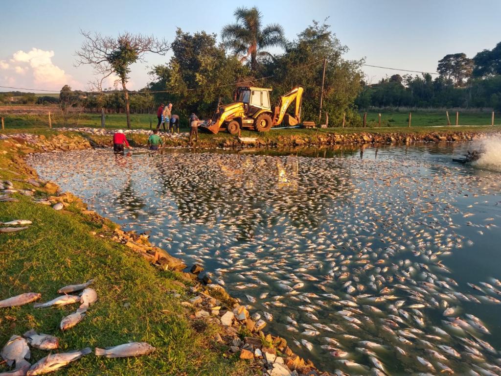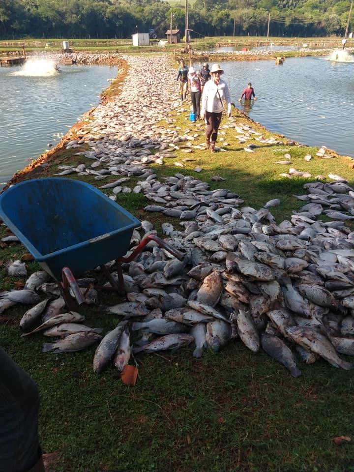 Uma família produtora de peixes, com açudes localizados em uma propriedade na Linha Sanga das Antas, interior de Nova Santa Rosa, divisa com o município de Maripá, teve uma perda de várias toneladas de peixes neste domingo.