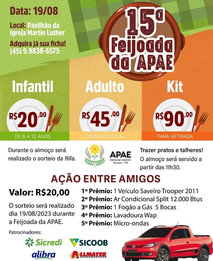 Mais informações para ser um doador da APAE de Marechal Rondon, ou comprar fichas para a 15º Feijoada, ou ainda para participar da rifa, através do telefone 45 99838-6575.