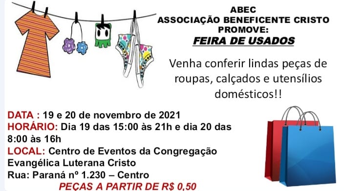 Está marcada para a sexta-feira e sábado desta semana, mais uma edição da Feira de roupas , calçados e utensílios, da Associação Beneficente Cristo, de Marechal Cândido Rondon.