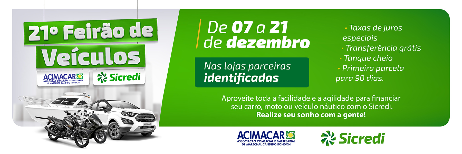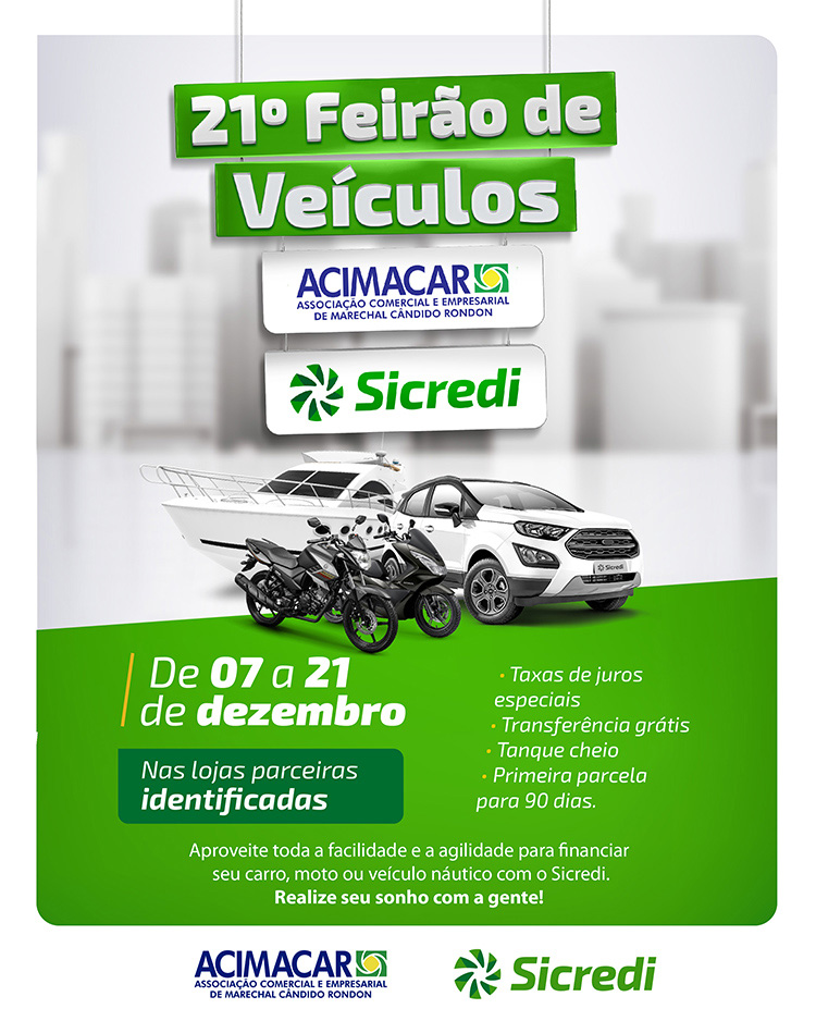 Desde segunda-feira, está acontecendo o 21º Feirão de Veículos, promovido pela Associação Comercial e Empresarial de Marechal Cândido Rondon e pela Sicredi Aliança PR/SP.