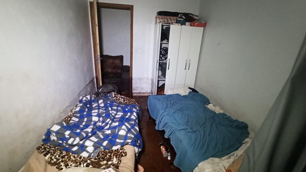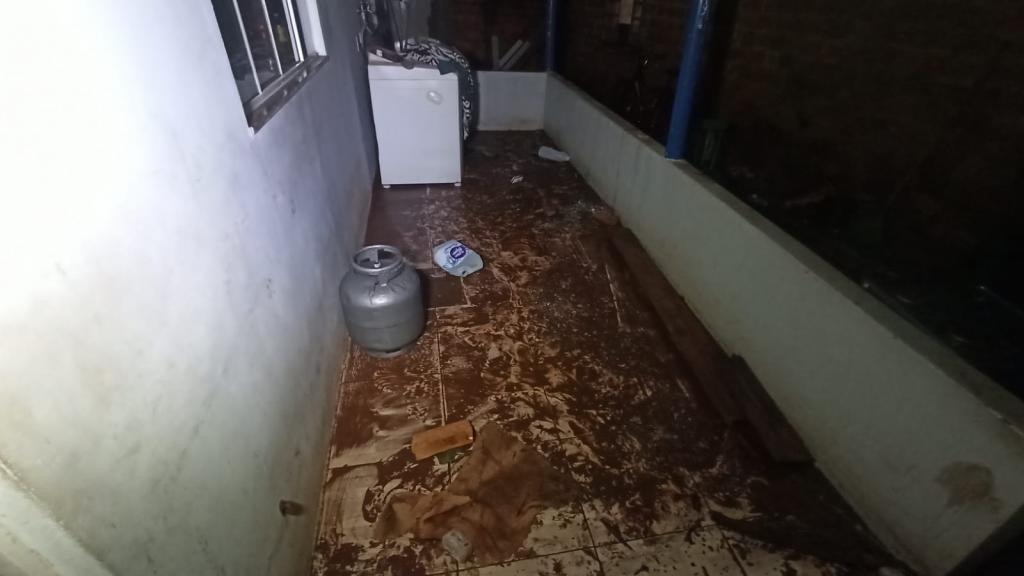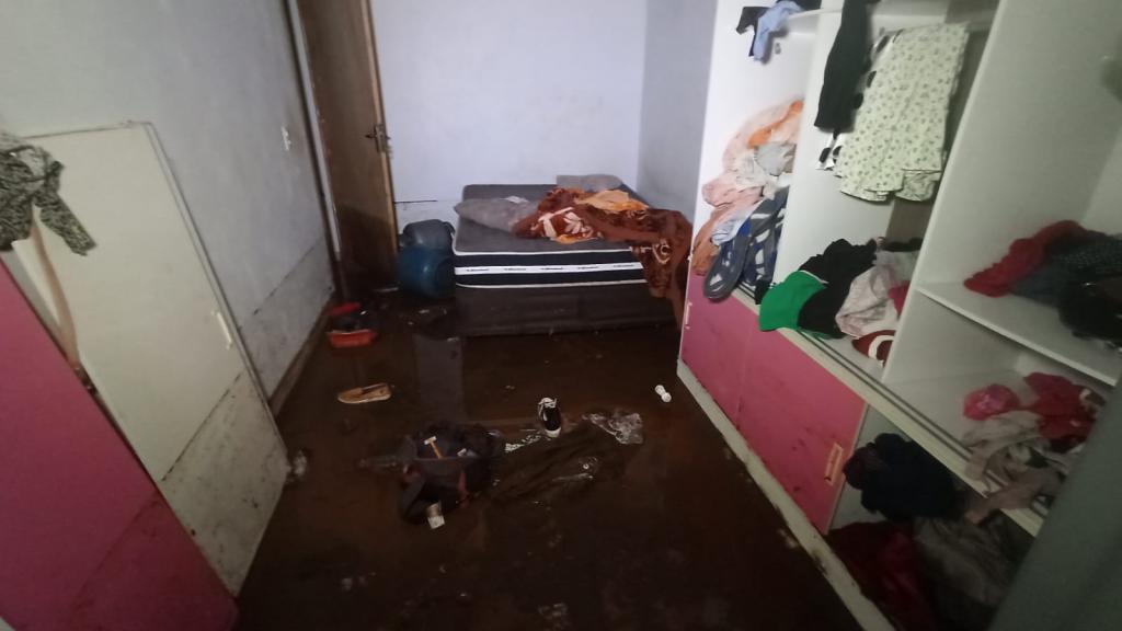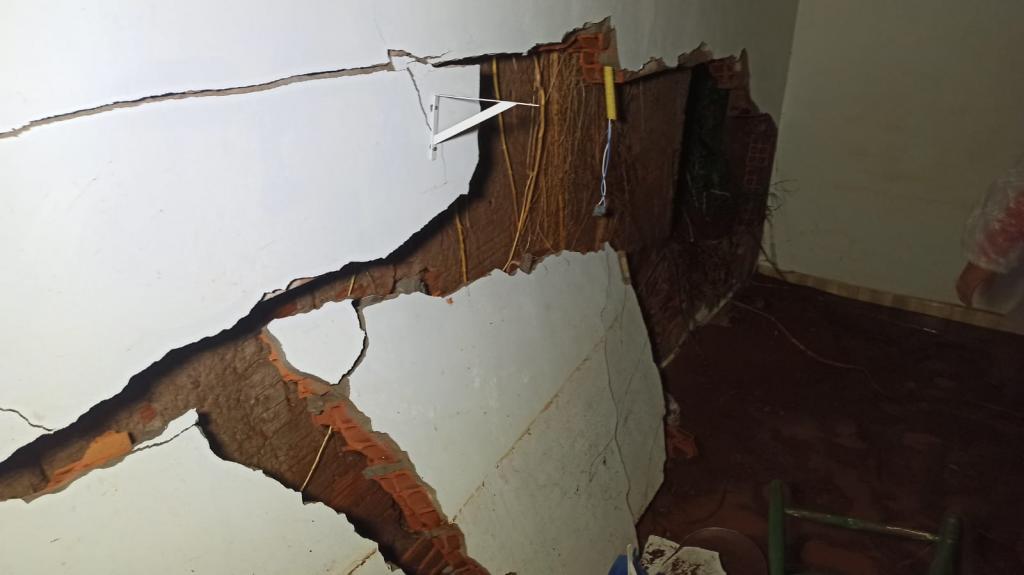 Na Vila Paulista na Rua Antônio Humberto Guimarães uma residência de tamanho pequeno de alvenaria que fica aos fundos de outra casa, teve parte da parede desmoronada alagando toda a residência e afetando todos os móveis, como cama, colchão, sofá, fogão e geladeira.