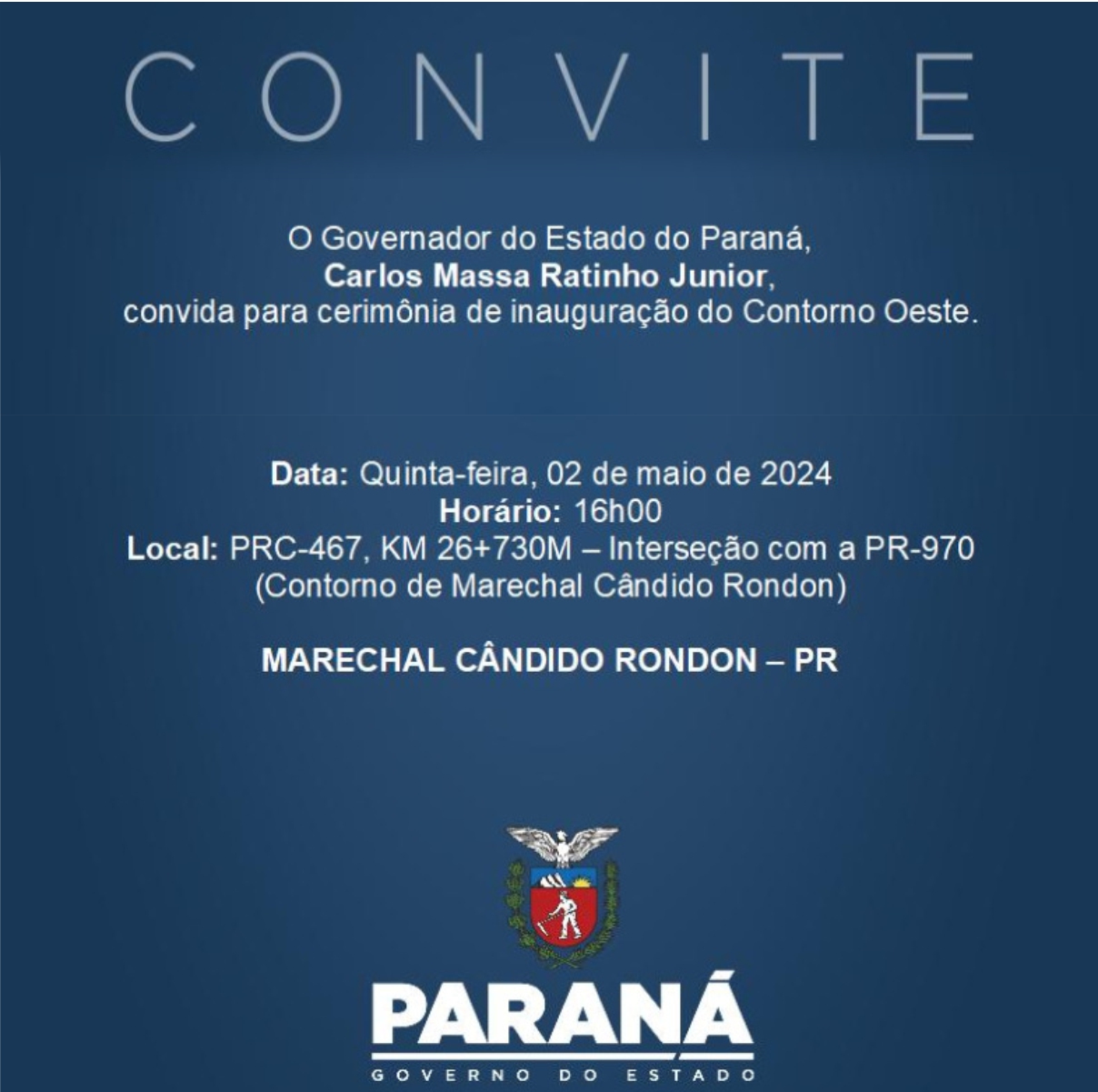 O governador Ratinho Junior estará na região nesta quinta-feira e, conforme sua assessoria, em Marechal Cândido Rondon , às 16 horas, vai inaugurar o novo Contorno Oeste, recentemente concluído e liberado para o tráfego de veículos.